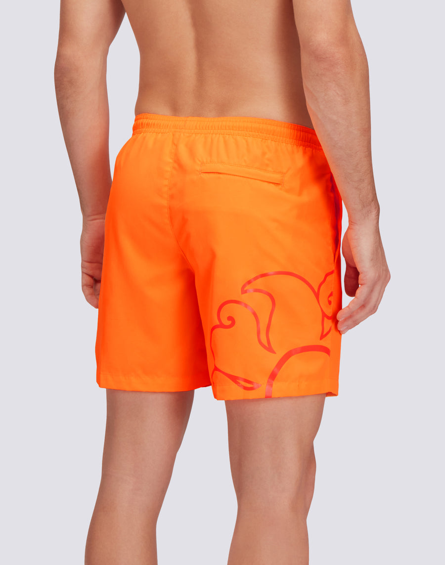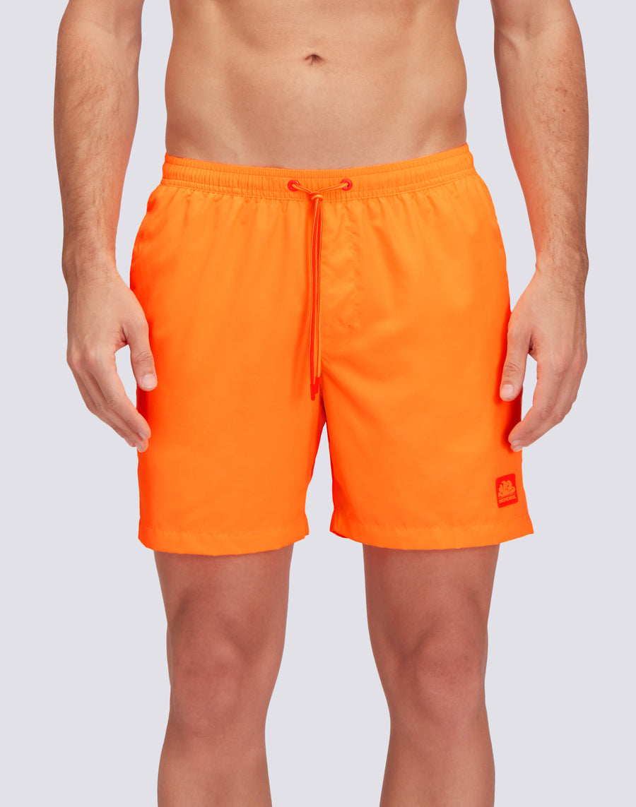 Short de bain pour homme, longueur moyenne, taille élastiquée. Equipé d'un cordon de serrage et d'une poche arrière zippée. Il sèche rapidement grâce au polyester léger avec lequel il est fabriqué. Longueur extérieure de la jambe 16"/41 cm (en taille M).