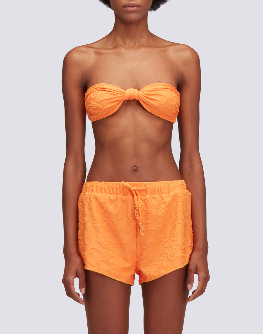 Short femme en éponge jacquard avec motif SK23. Avec une taille élastiquée et un cordon de serrage, ils sont parfaits à porter sur un bikini à motifs assortis.
