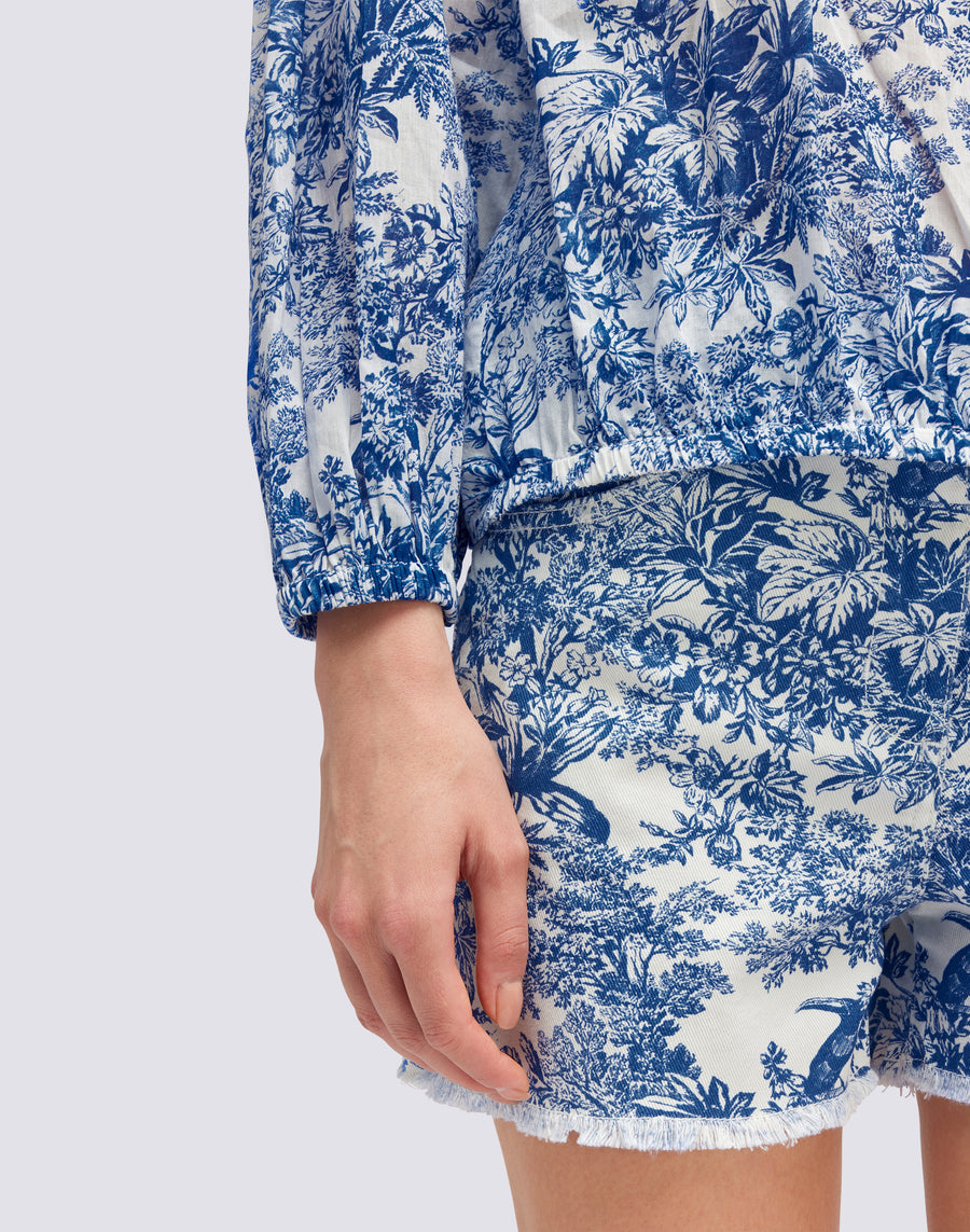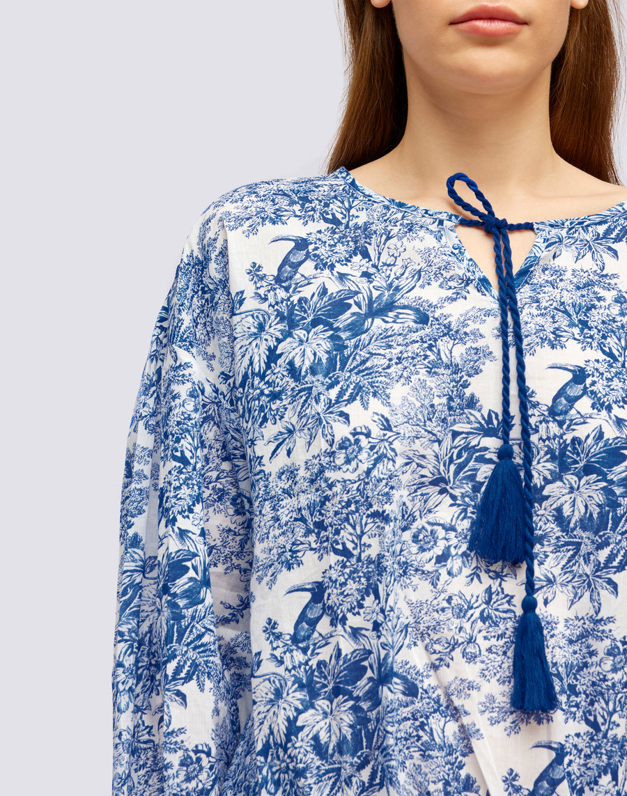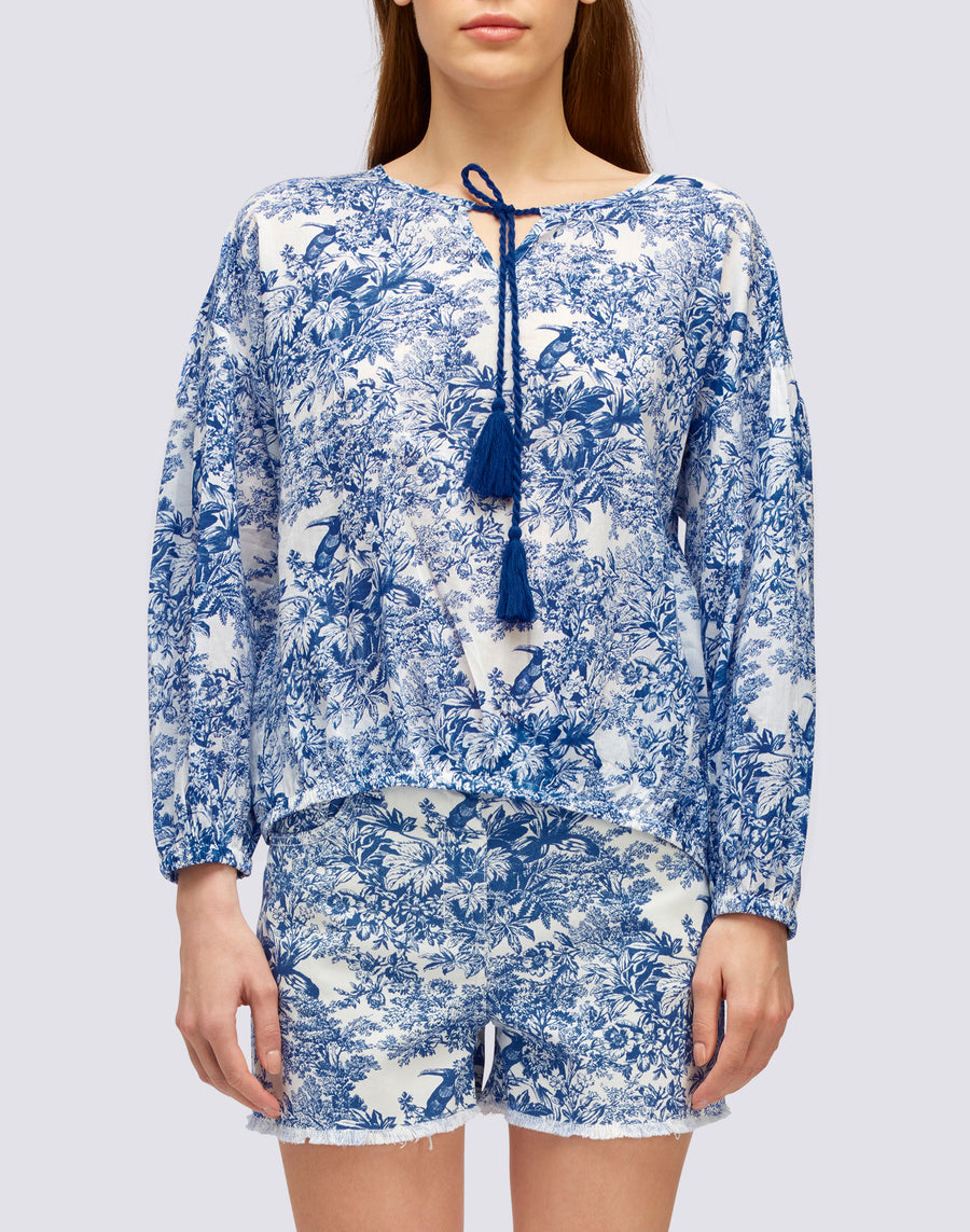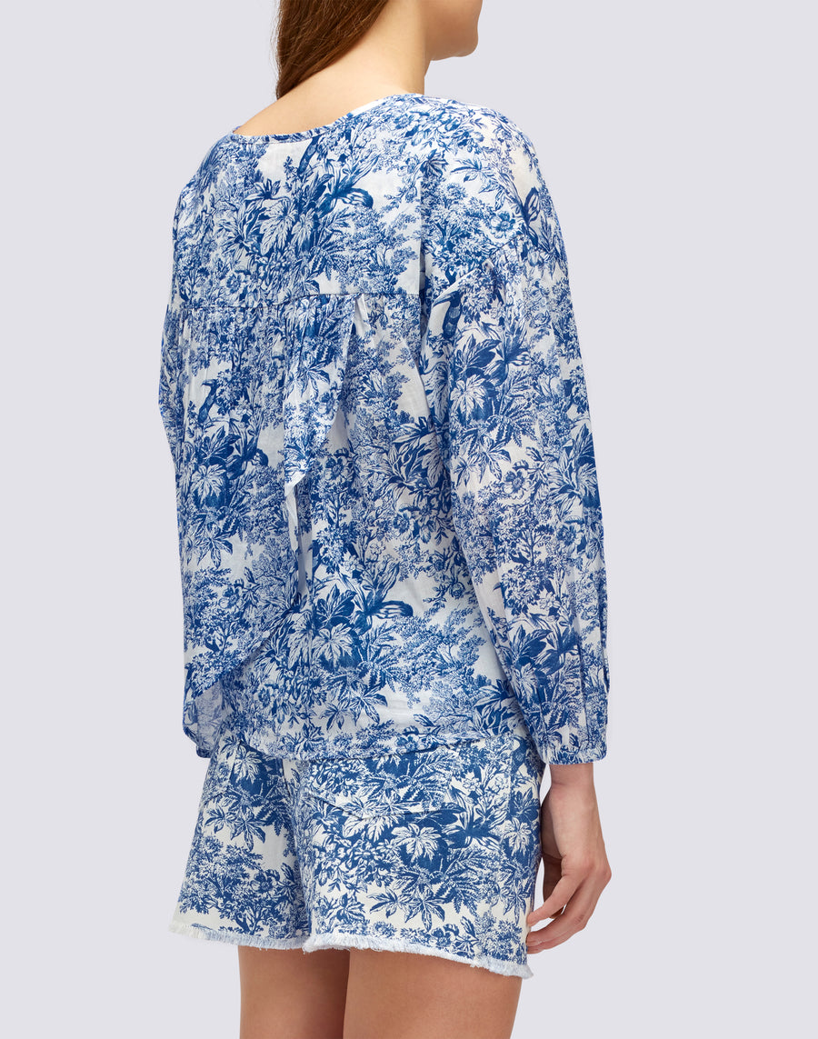 La blouse imprimé Toile De Jouy se caractérise par un détail avec une ouverture au dos et une fermeture au col avec galon et pompons. Les manches longues aux poignets élastiqués ajoutent une touche d'élégance à ce vêtement polyvalent et confortable.