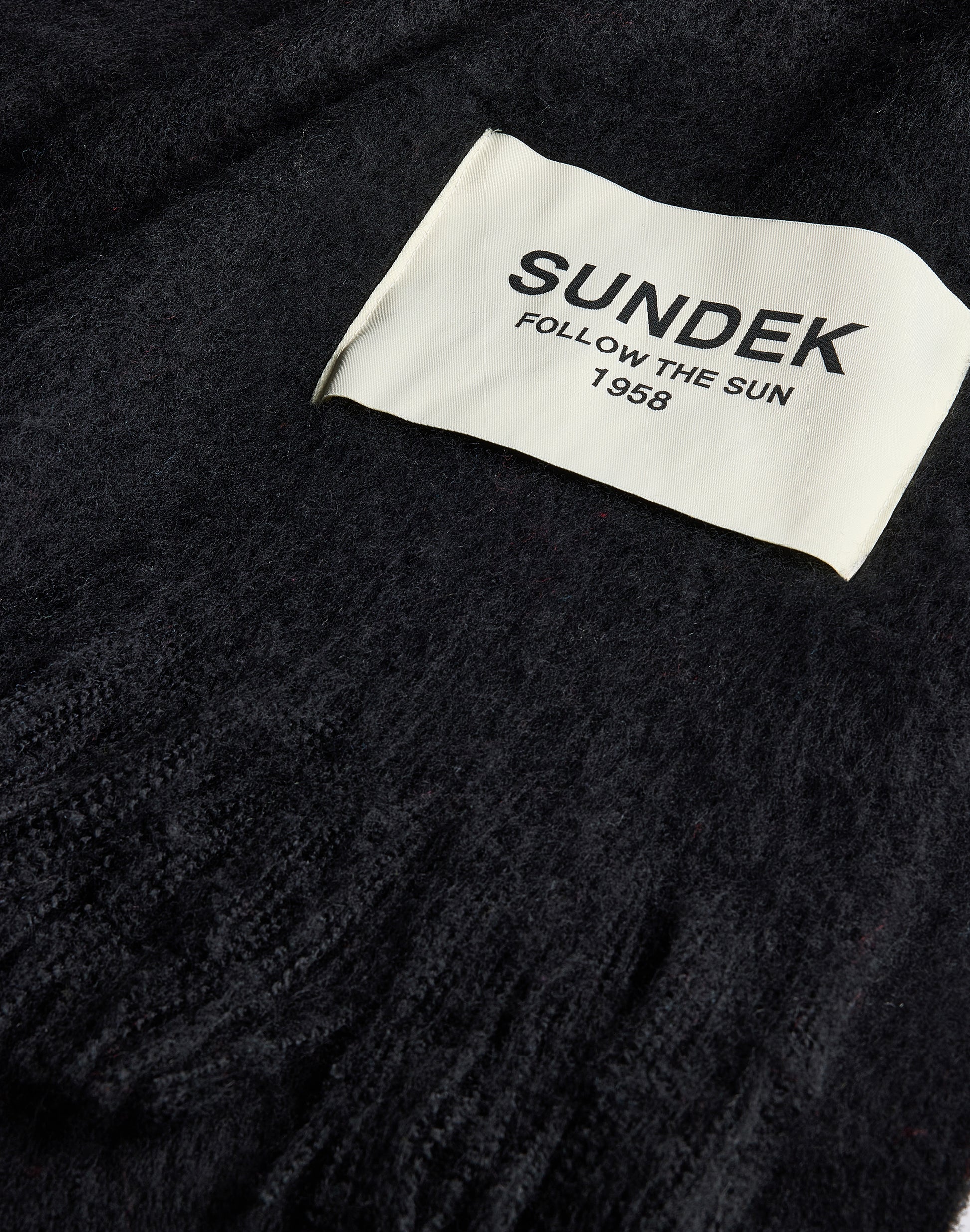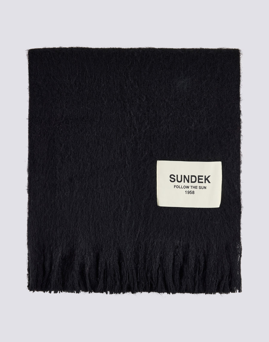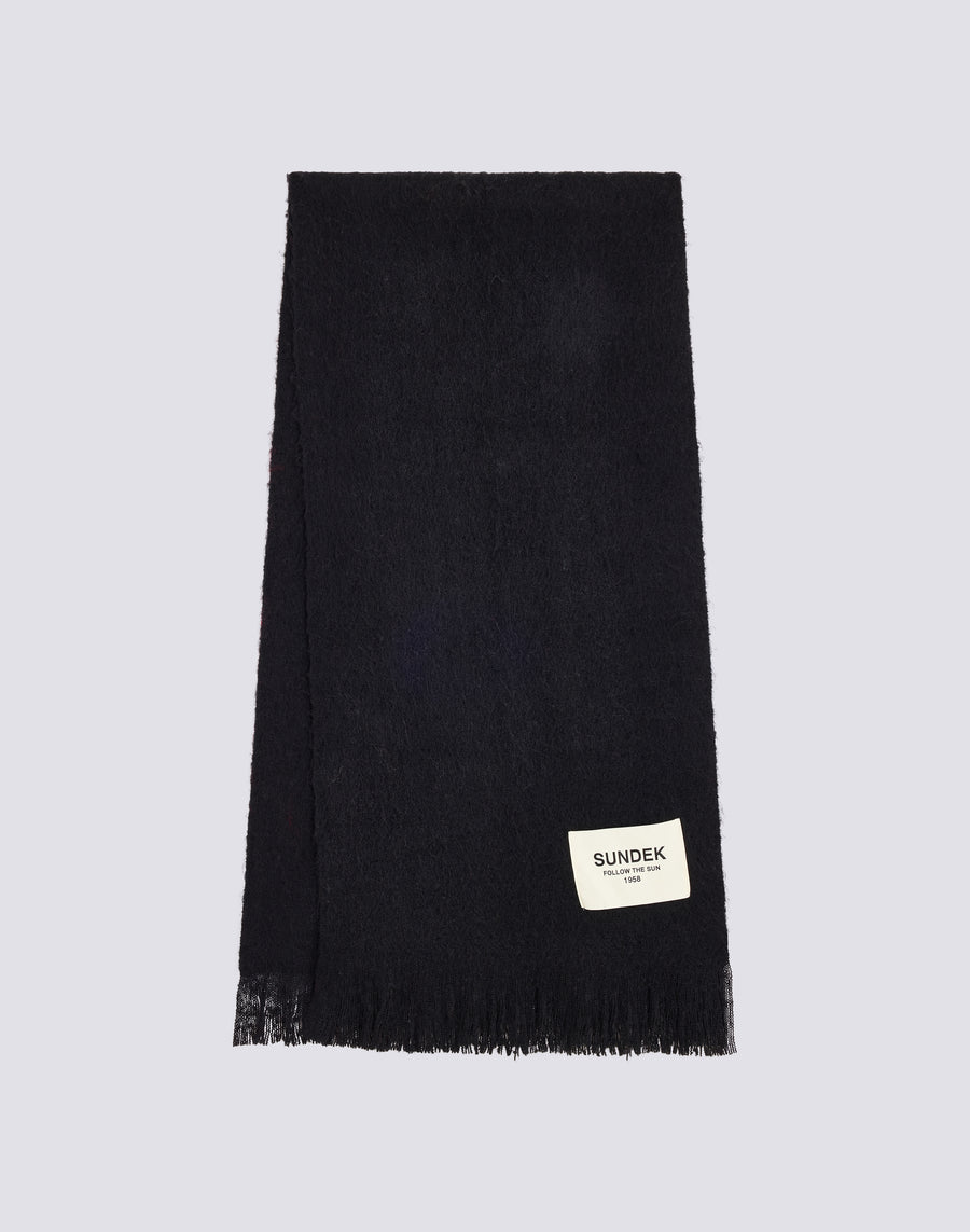 Sciarpa a tinta unita, etichetta logo grande e mini frange, l'accessorio must-have per le giornate invernali.
