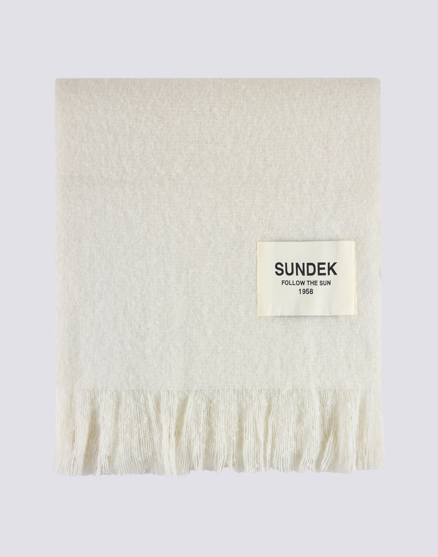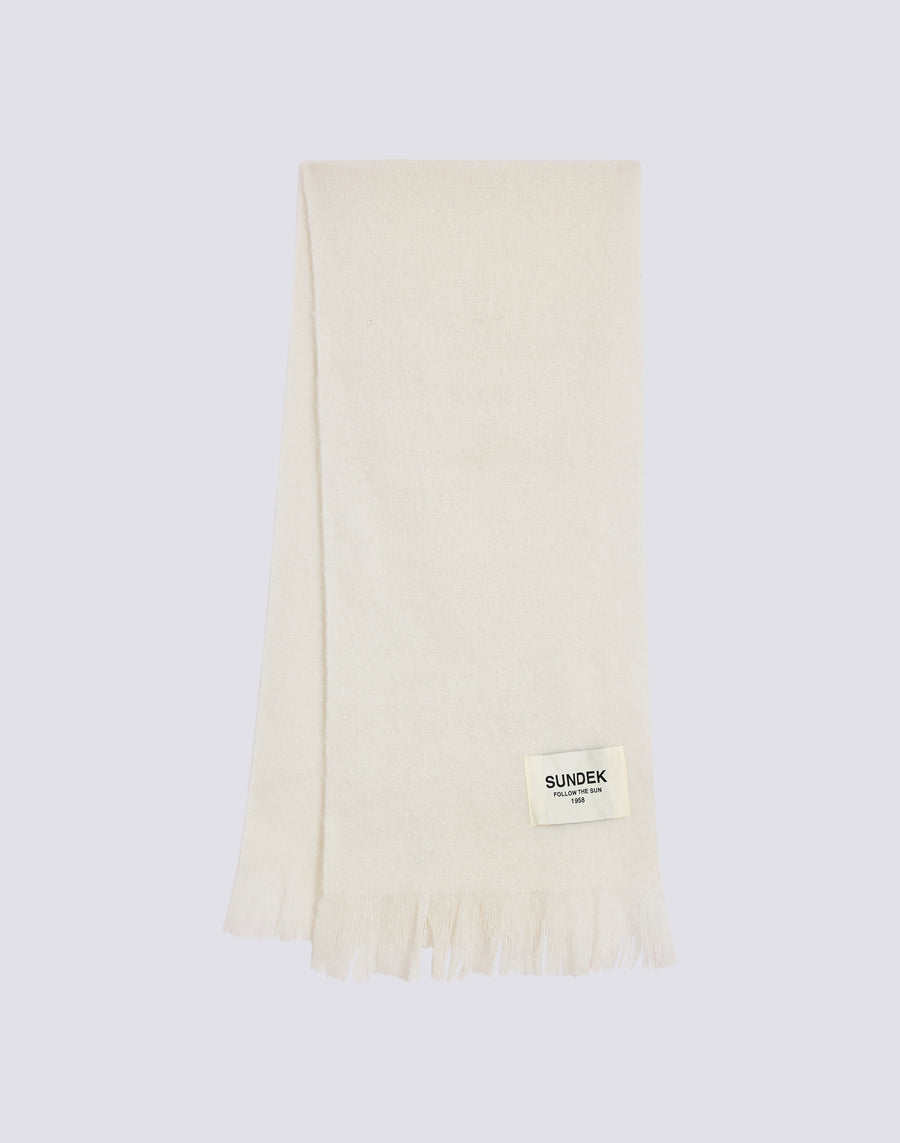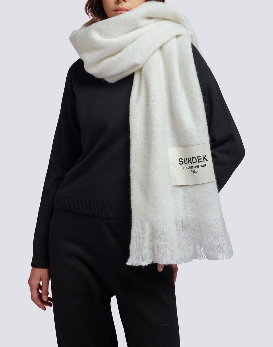 Sciarpa a tinta unita, etichetta logo grande e mini frange, l'accessorio must-have per le giornate invernali.