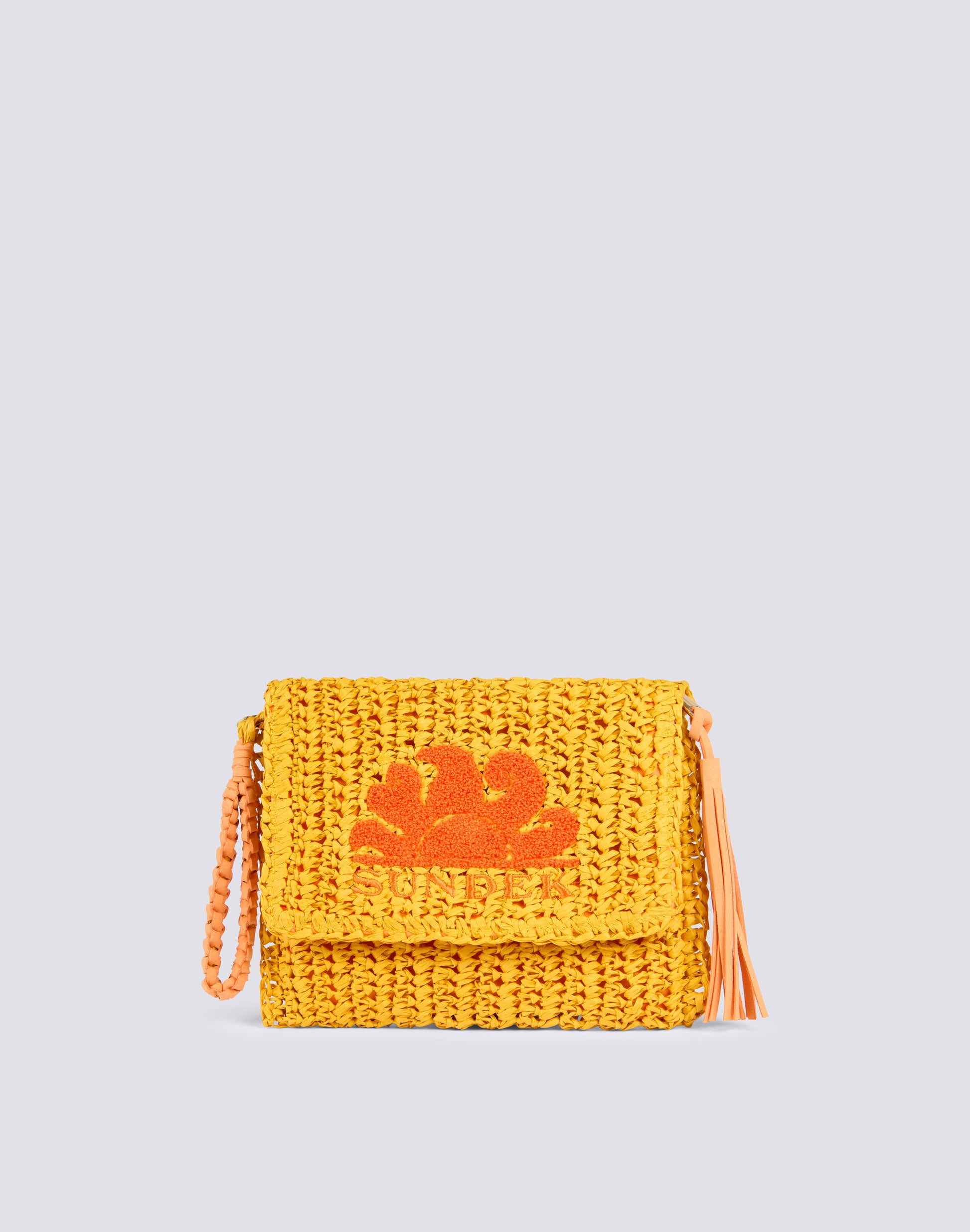 Pochette Gabi in paper straw con chiusura a zip, asola passamano e logo in spugna frontale. Un accessorio minimal, da avere sempre con sé per portare il necessario.
