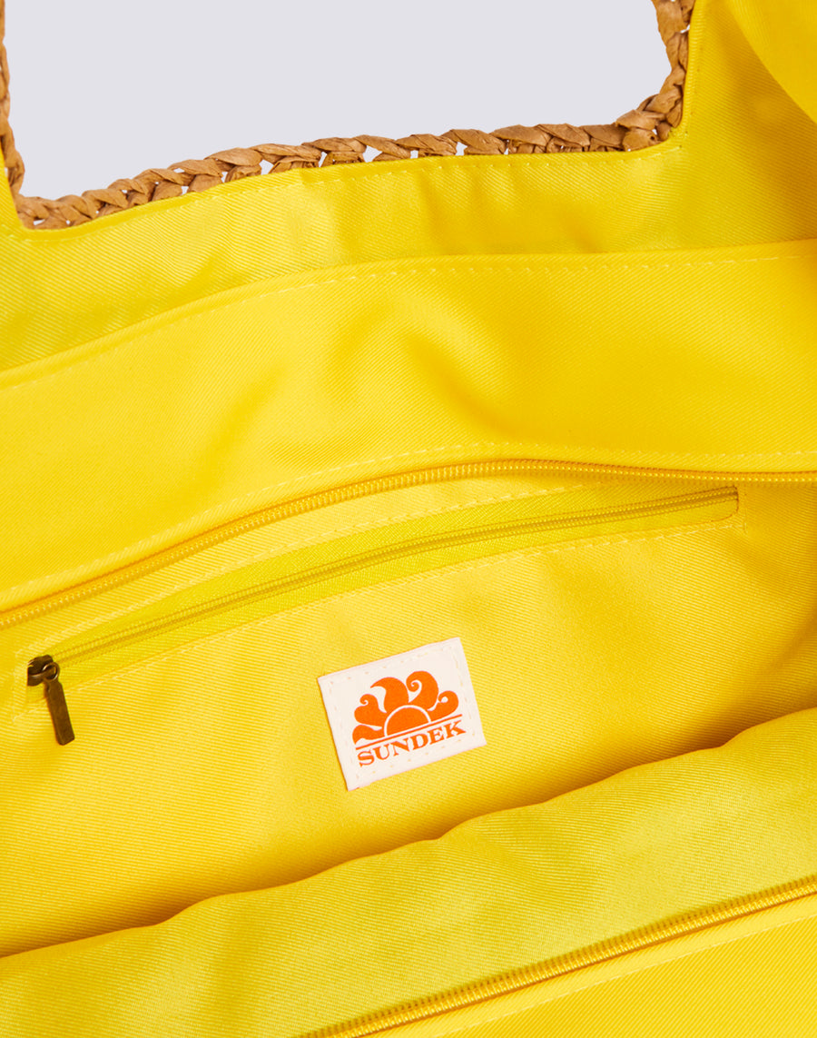 Shopping bag in paper effetto paglia con manici a contrasto. Capiente, dotata di chiusura con zip centrale, è ideale per una passeggiata o come borsa mare.