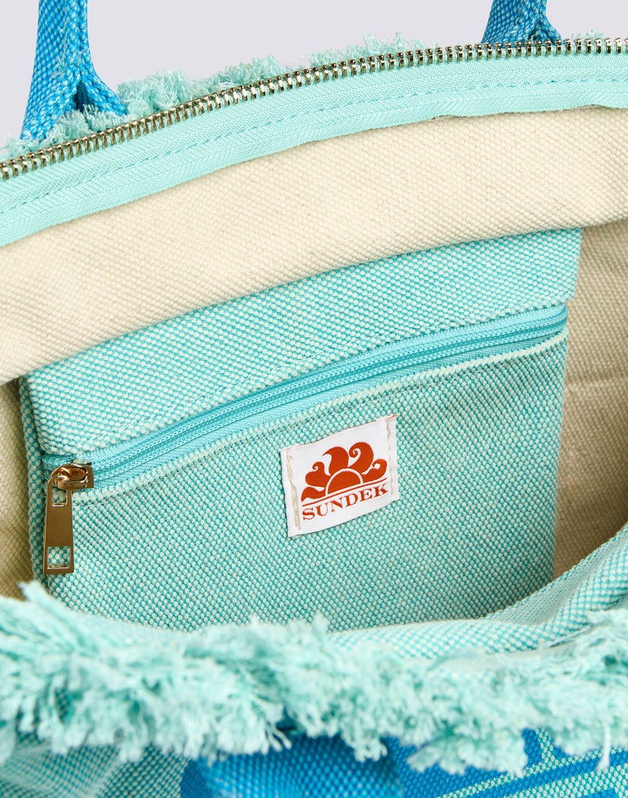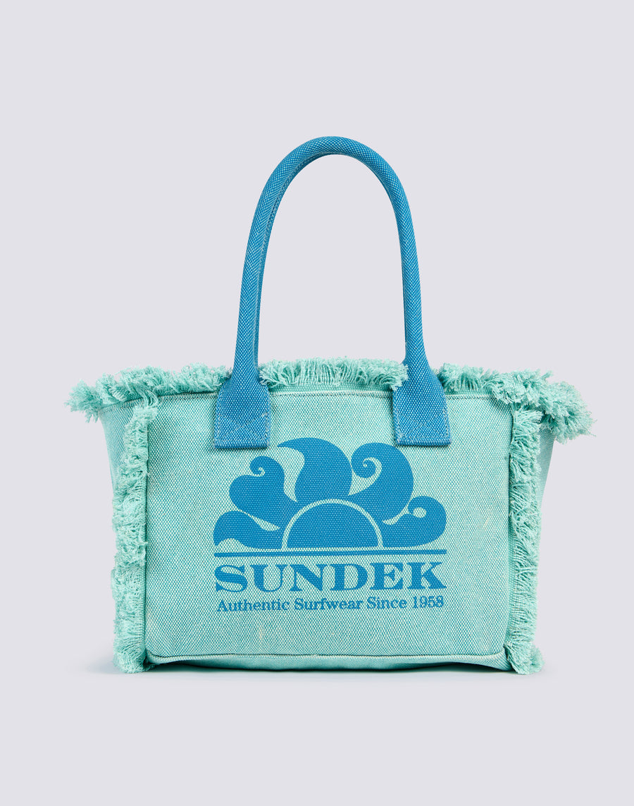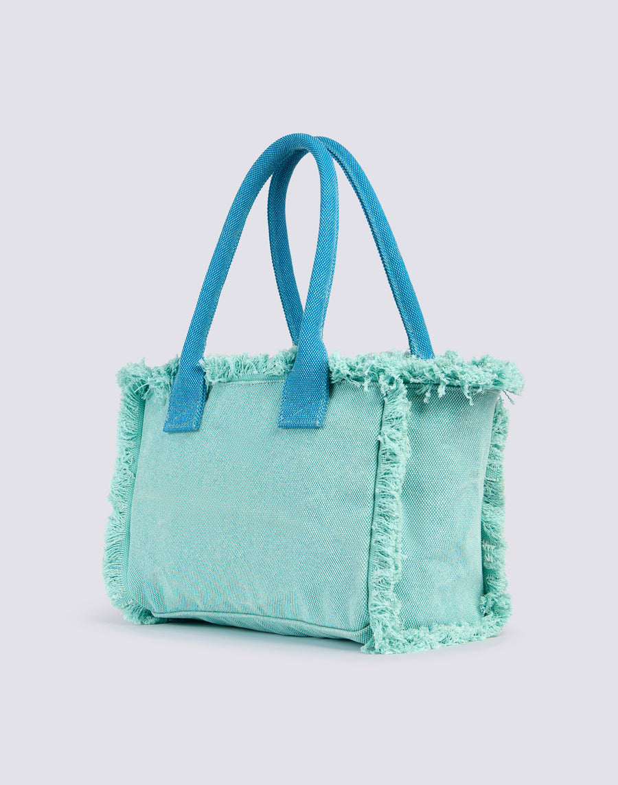 Tote bag formato regular con effetto stone washed, zip centrale, logo grande stampato e rifiniture in oro. Il dettaglio delle frange rende questo modello adatto a look decisi.