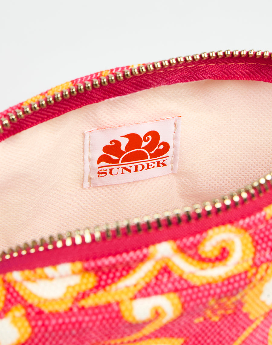 Pochette effetto stone washed con stampa SK23, chiusura con zip, asola passamano e rifiniture oro.