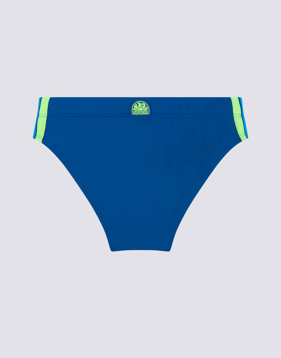 Immergiti nei colori dell'arcobaleno. Costume mare slip bambino in nylon Econyl rigenerato.