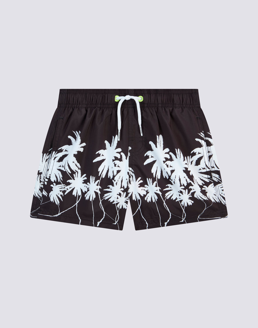 Costume da bagno con coulisse elastica in vita, in leggero tessuto Repreve® riciclato da bottiglie di plastica. Con stampa Black Palm e il tradizionale arcobaleno Sundek sul back. Lunghezza esterno coscia 10.25"/26 cm (in taglia 6anni).