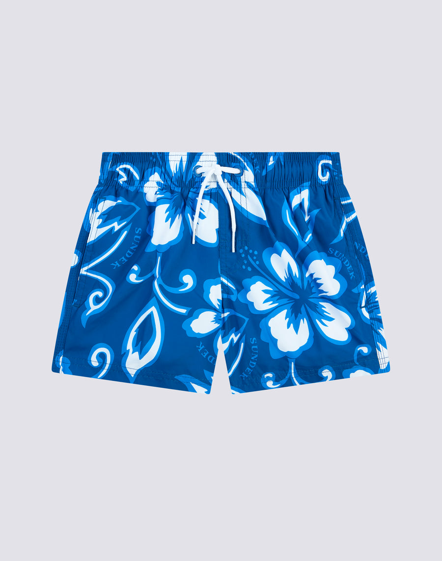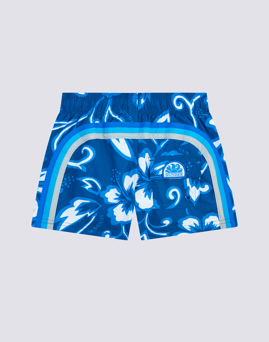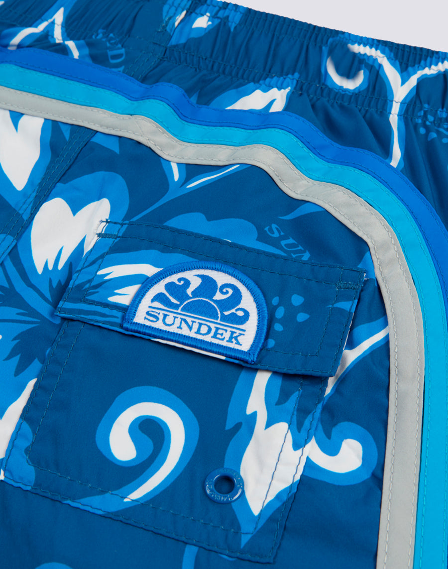 Costume da bagno con coulisse elastica in vita, in leggero tessuto Repreve® riciclato da bottiglie di plastica. Iconica stampa SK23 e il tradizionale arcobaleno Sundek sul back. Larghezza esterno coscia 10.25"/26 cm (taglia 6 anni). Abbina anche lo slip della stessa fantasia!