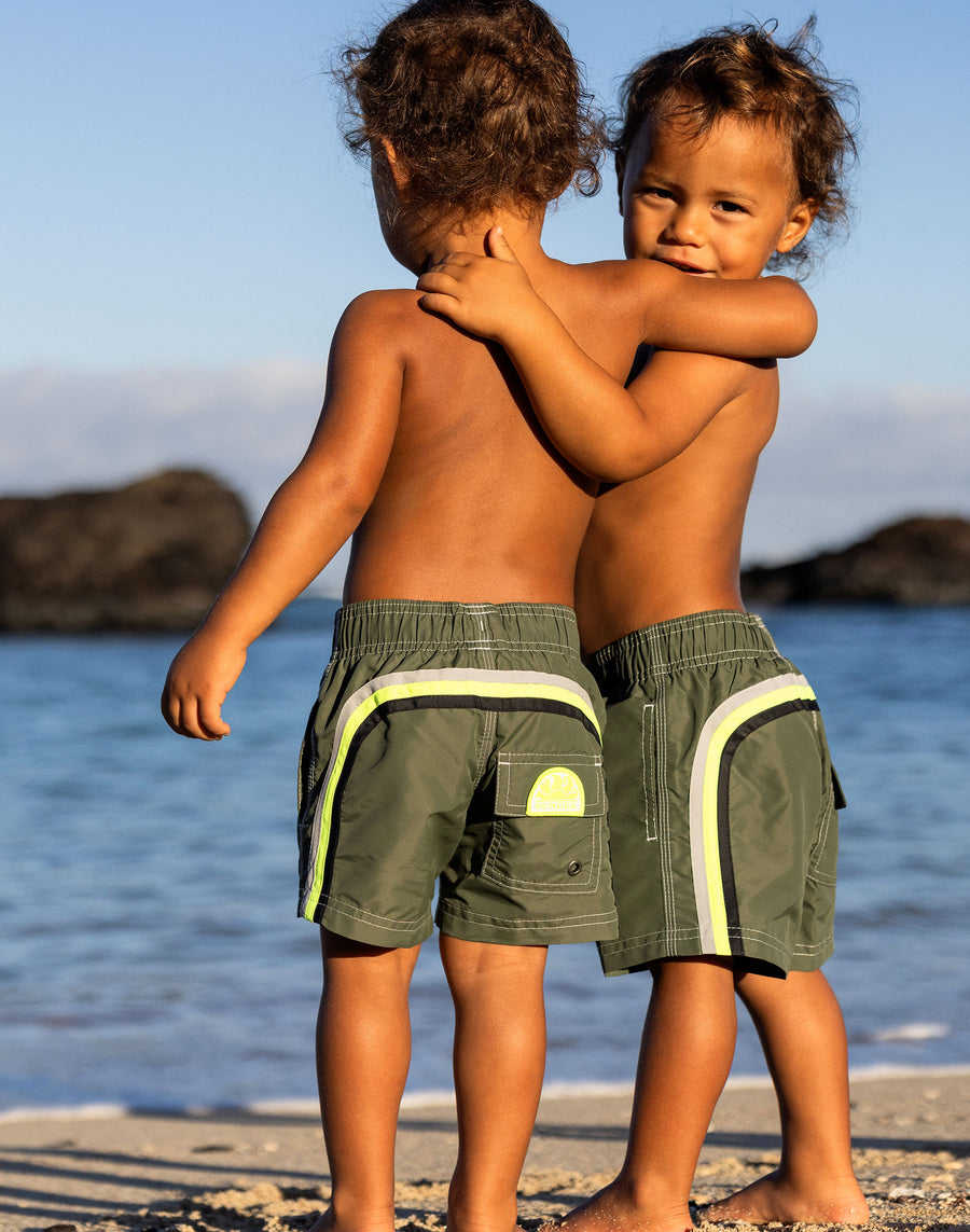 Colore intenso e tessuto iper-confortevole ad asciugatura rapida per questi pantaloncini mare bimbo. Un modello che accompagnerà il tuo bimbo nelle sue mille attività in vacanza, perfetto per muoversi e giocare in piena libertà. è realizzato nel nostro tessuto storico nylon-taffetà e costruito con cuciture a tre aghi che lo rendono resistente nel tempo. Da mettere in valigia, anno dopo anno.