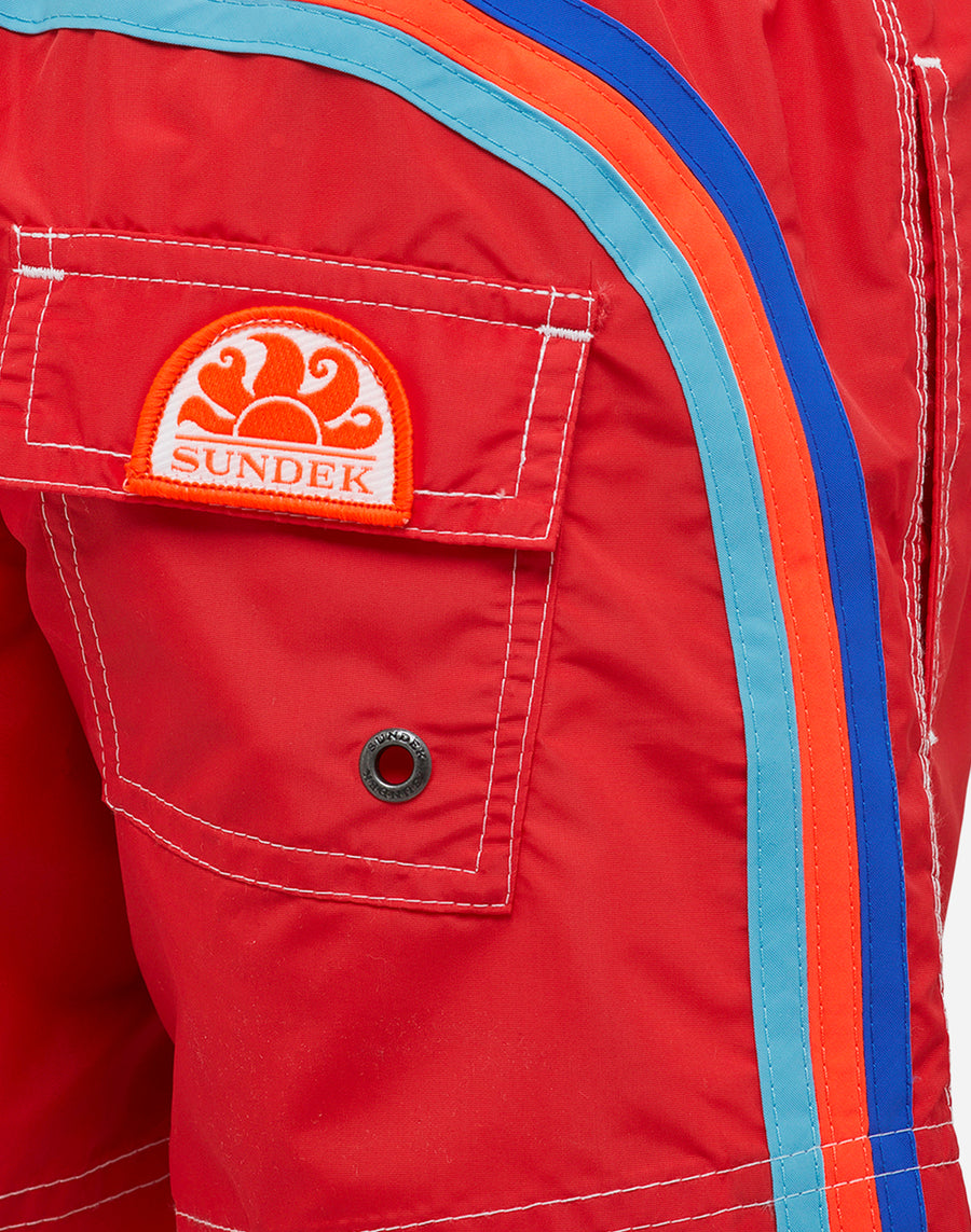 Colore intenso e tessuto iper-confortevole ad asciugatura rapida per questi pantaloncini mare bimbo. Un modello che accompagnerà il tuo bimbo nelle sue mille attività in vacanza, perfetto per muoversi e giocare in piena libertà. è realizzato nel nostro tessuto storico nylon-taffetà e costruito con cuciture a tre aghi che lo rendono resistente nel tempo. Da mettere in valigia, anno dopo anno.