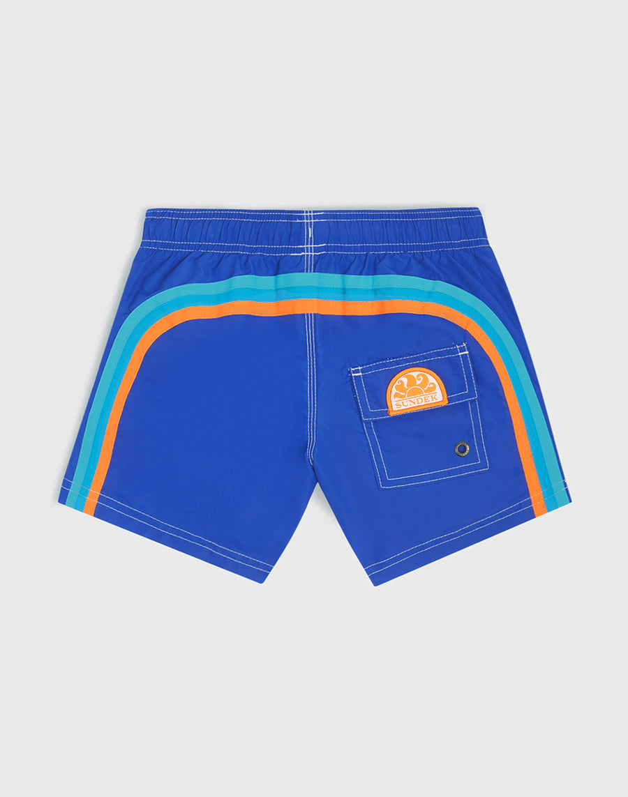 Colore intenso e tessuto iper-confortevole ad asciugatura rapida per questi pantaloncini mare bimbo. Un modello che accompagnerà il tuo bimbo nelle sue mille attività in vacanza, perfetto per muoversi e giocare in piena libertà. è realizzato nel nostro tessuto storico nylon-taffetà e costruito con cuciture a tre aghi che lo rendono resistente nel tempo. Da mettere in valigia, anno dopo anno.