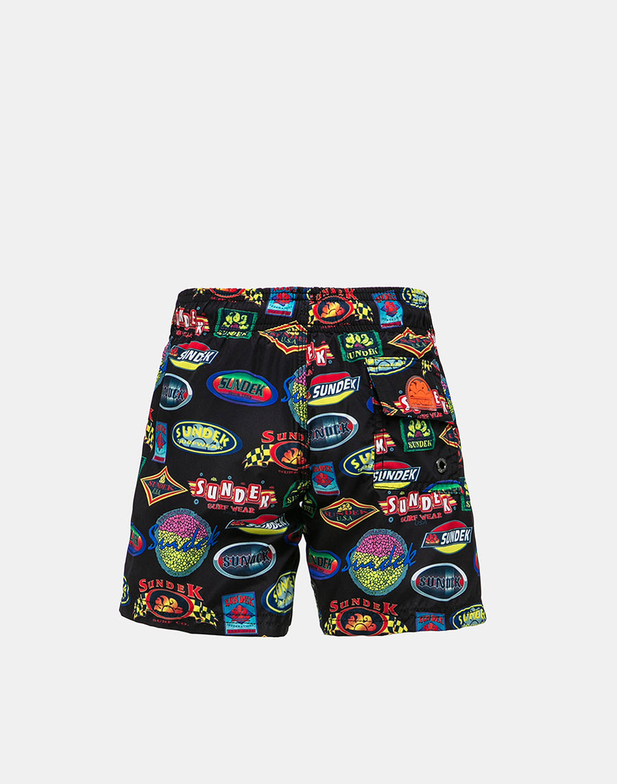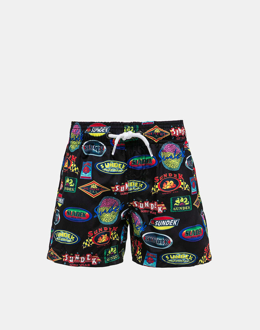 Un costume ricco di stile grazie alla stampa dei loghi Sundek storici che completano un modello comodo e facile da indossare grazie all'elastico in vita con coulisse. In tessuto riciclato leggero, resistente e che si asciuga rapidissimo, per la comodità dei piccoli dinamici che alternano i bagni ai giochi sulla spiaggia.