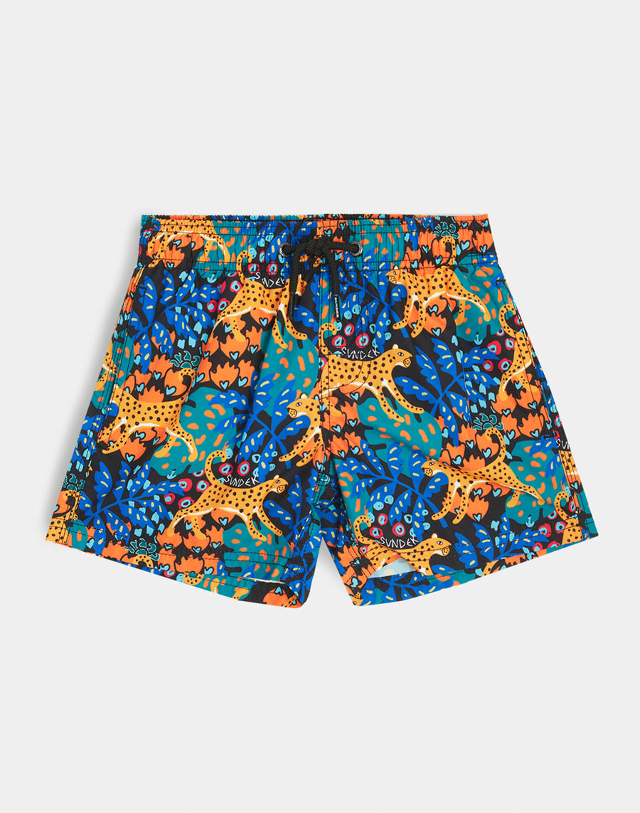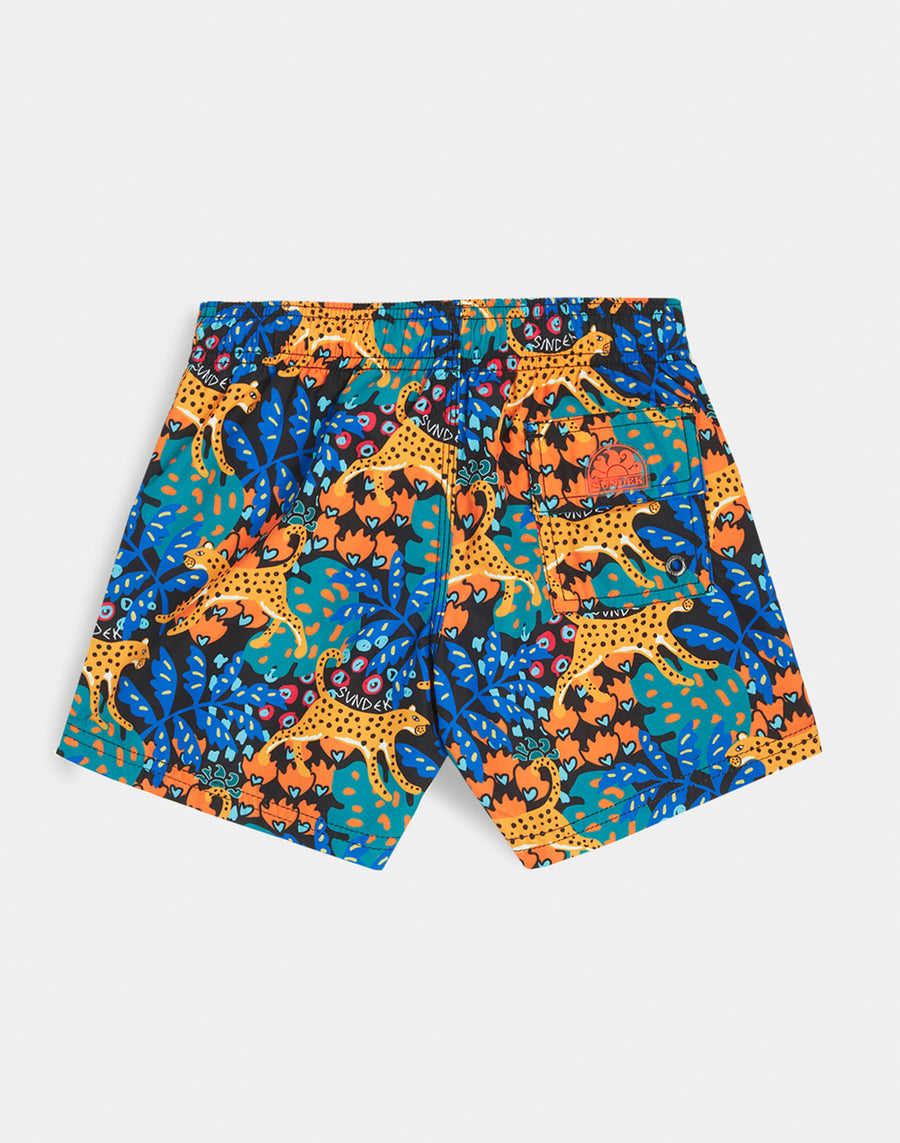 Colori intensi e tessuto iper-confortevole in poliestere riciclato per questi pantaloncini mare bimbo. Un modello che accompagnerà il tuo bimbo nelle sue mille attività in vacanza, perfetto per muoversi e giocare in piena libertà. Realizzato con stampa safari, è da mettere in valigia, anno dopo anno.