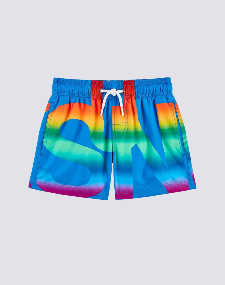 Costume a pantaloncino da bambino corto con stampa maxi logo in poliestere leggero riciclato. Vivace e super colorate per le avventure estive al mare o in piscina.