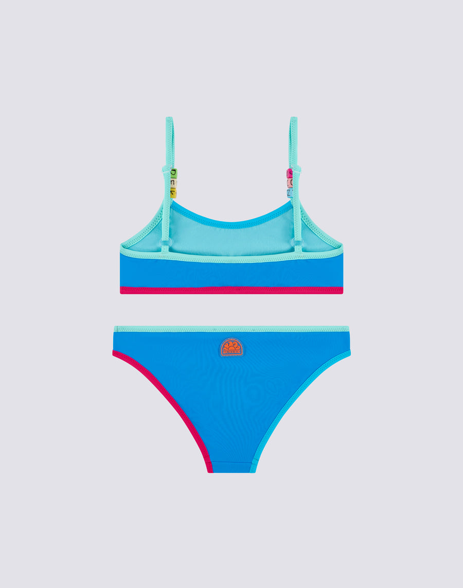 Bikini mare bambina con top e slip fissi, con lacci e piping a contrasto. I due pezzi del costume sono realizzati in tessuto VITA by Carvico confortevole, resistente, che non teme cloro e creme solari.