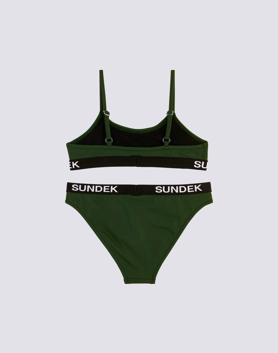 Scegli per la tua bimba questo bikini composto da top a fascia e slip con elastico, personalizzati dal logo a contrasto. Il tessuto ecosostenibile, morbido e resistente è adatto a mille bagni e giochi in spiaggia.