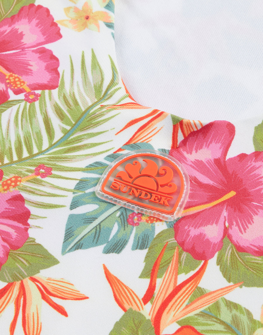 Questo costume intero con stampa Tropicana è perfetto per le giovani amanti della natura e dei colori vivaci. Realizzato con materiali di alta qualità per garantire massimo comfort e resistenza.