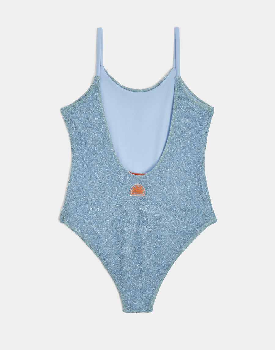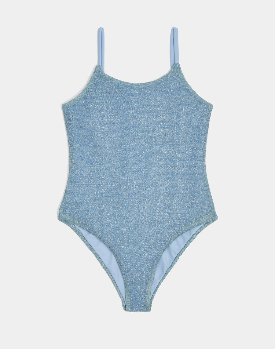 Scintillante grazie al lurex, da sfoggiare sulla riva o in una giornata in piscina, in coordinato col modello da adulto per la mamma.
