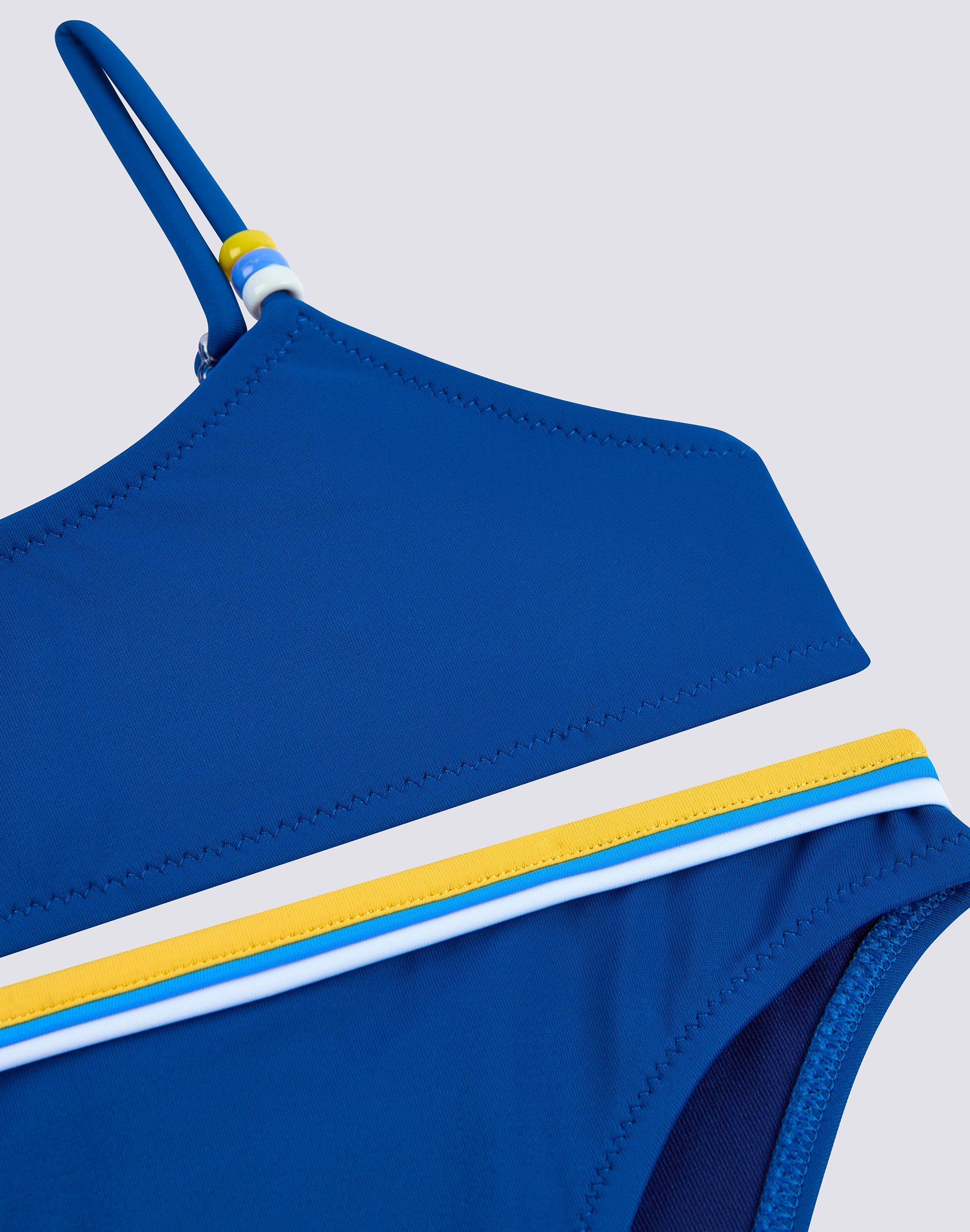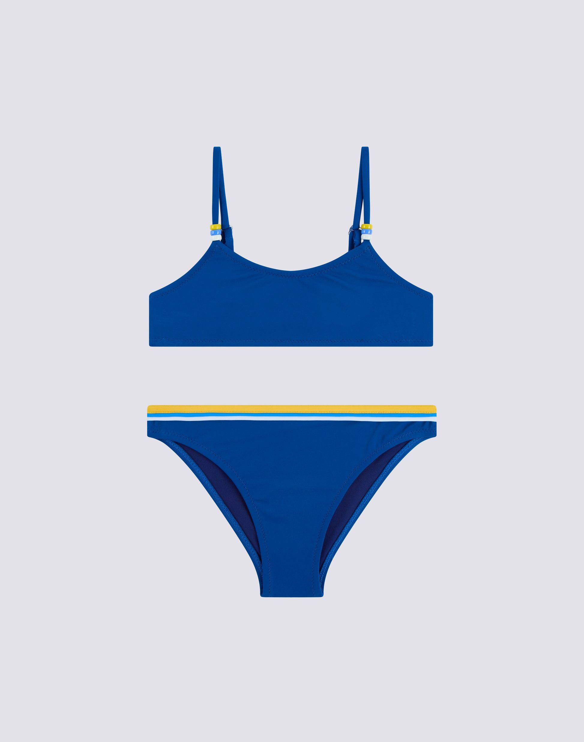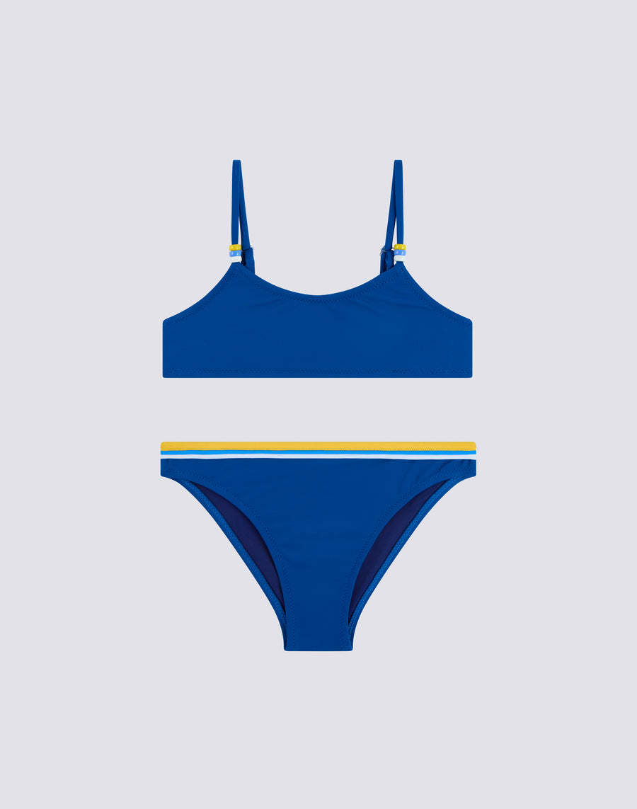 Bikini mare bambina con top regolabile con i laccetti impreziositi da perline. Il colore delle perline è riproposto sul dettaglio tricolore dello slip. I due pezzi del costume sono realizzati in tessuto VITA by Carvico confortevole, resistente e che non teme cloro e creme solari.