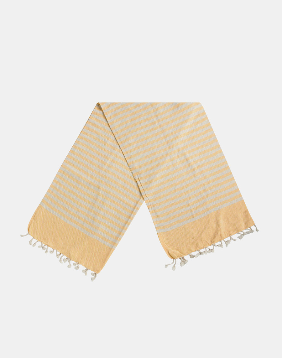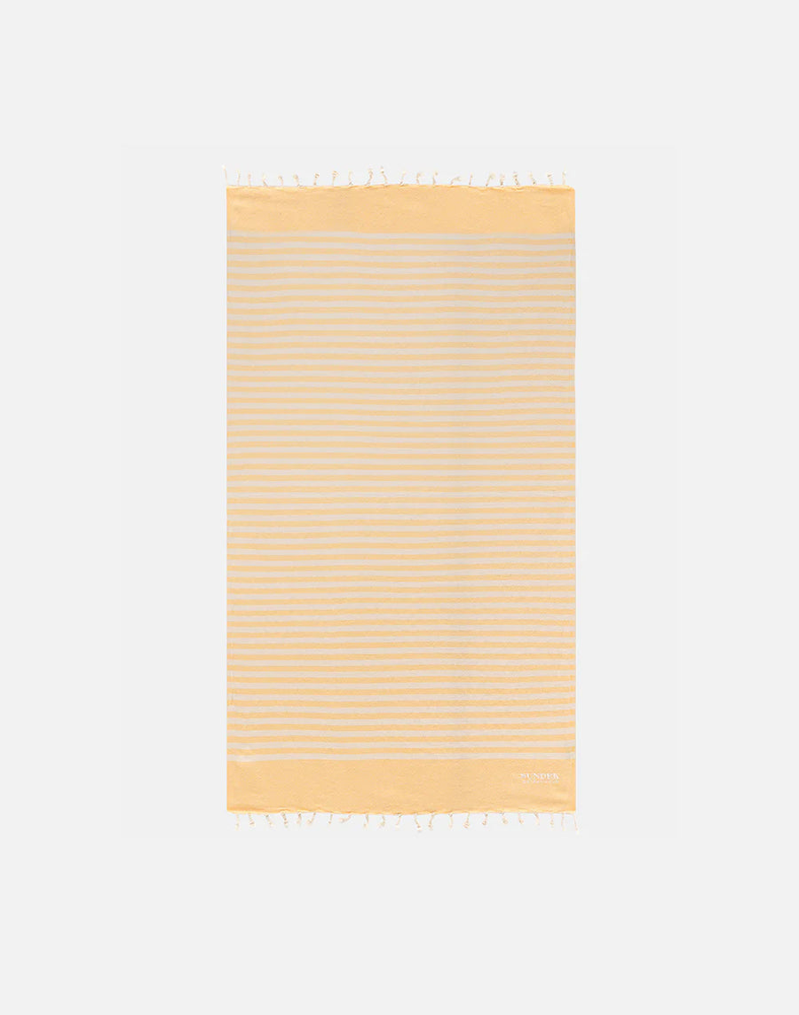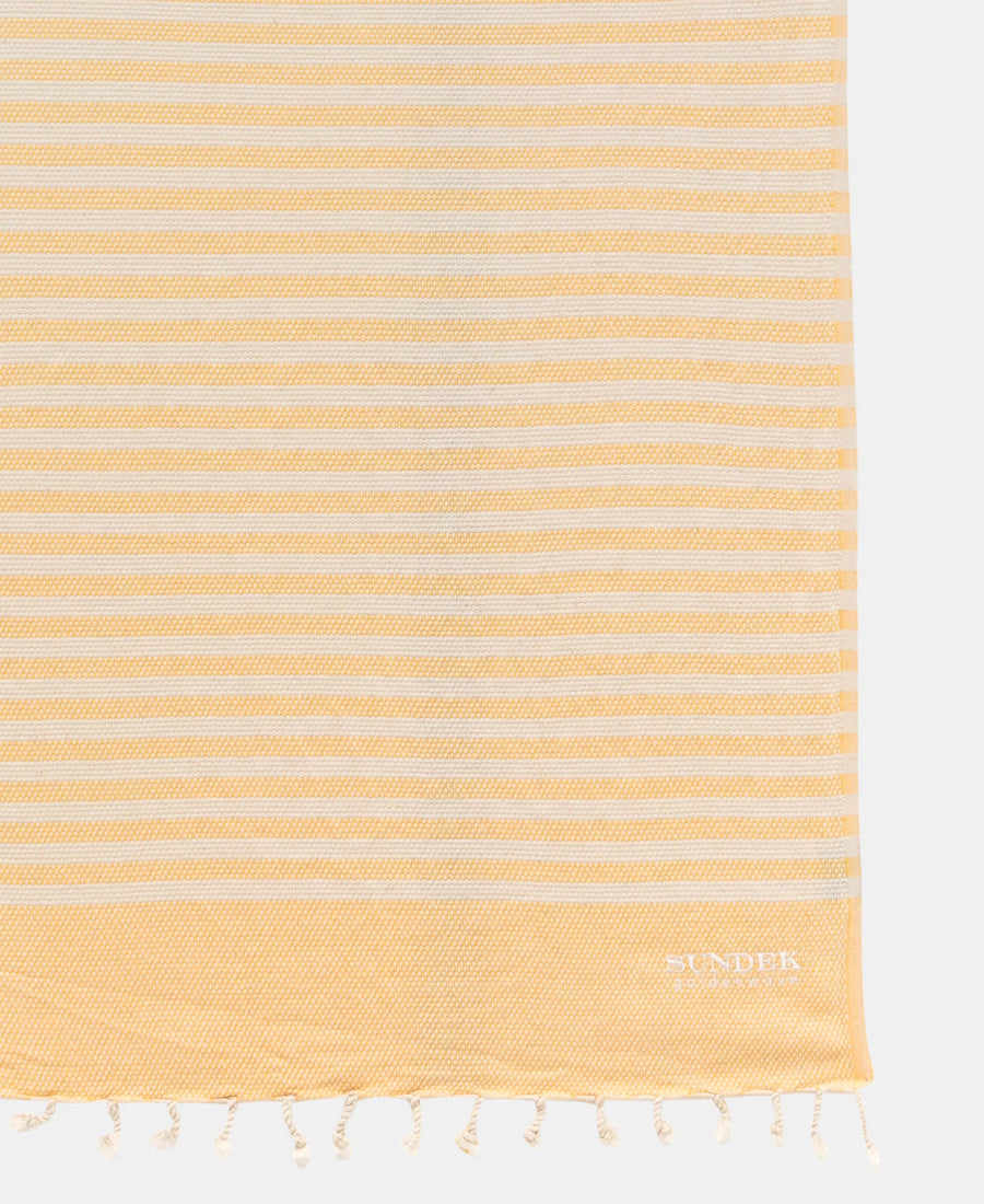 Telo fouta jacquard con righe a trama a nido d'ape, logo Sundek Goldenwave ricamato a contrasto, e fondi con frange intrecciate.