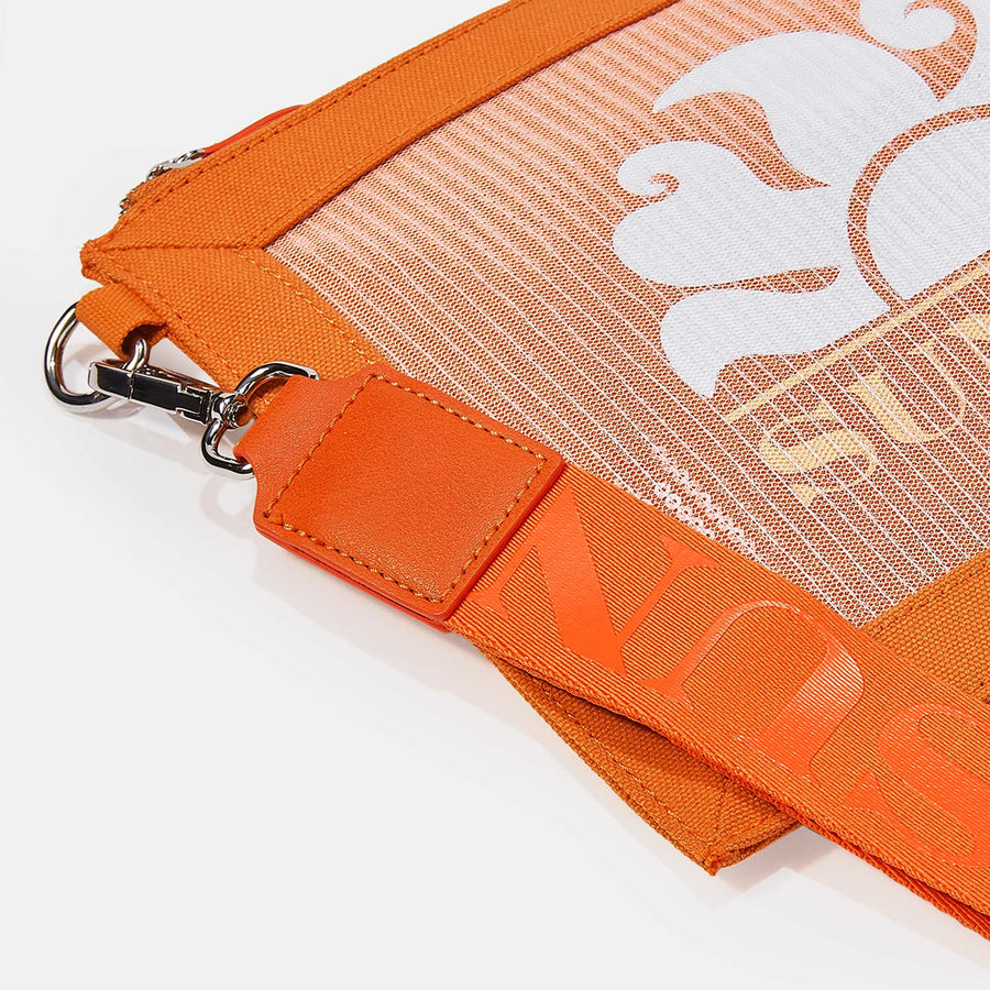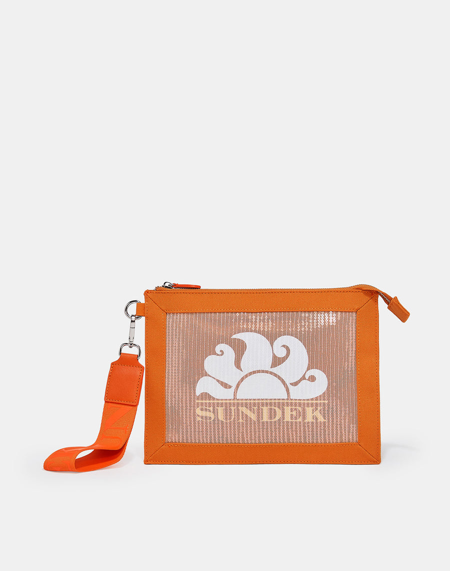 Clutch in mesh con paillettes e logo Sundek ricamato.Perfetta sia come necessaire che da usare come pochette. Laccetto con logo Sundek rimovibile