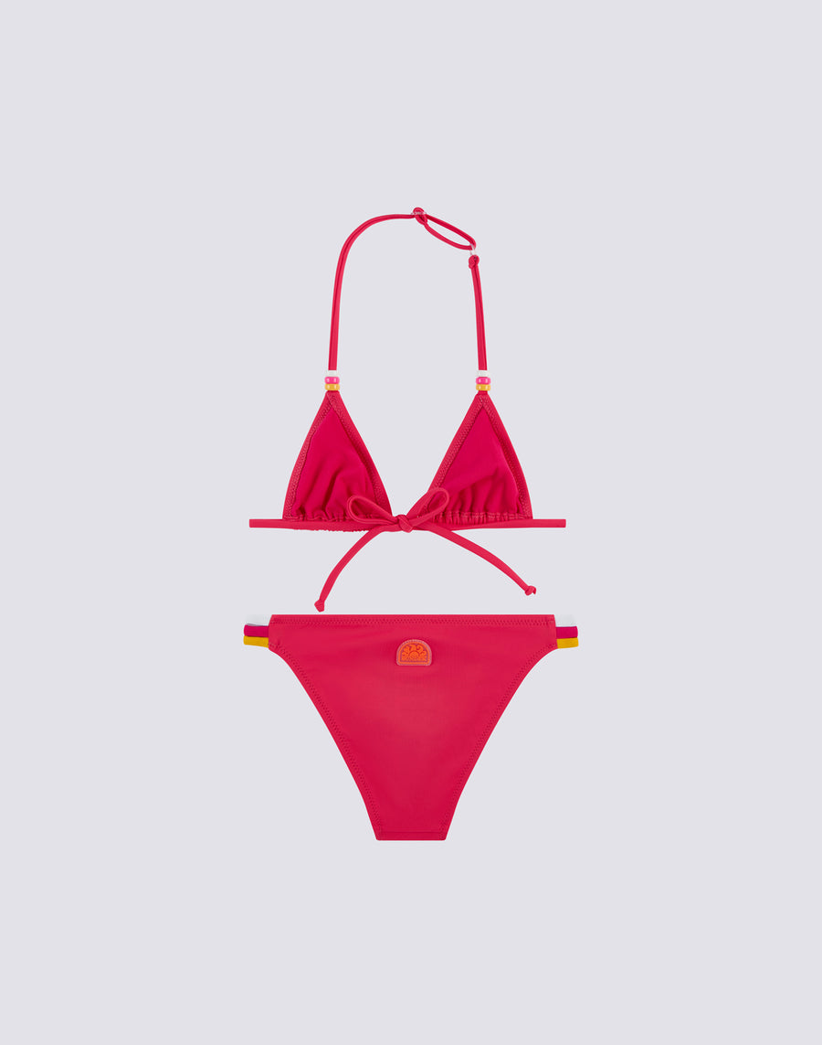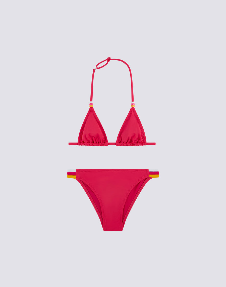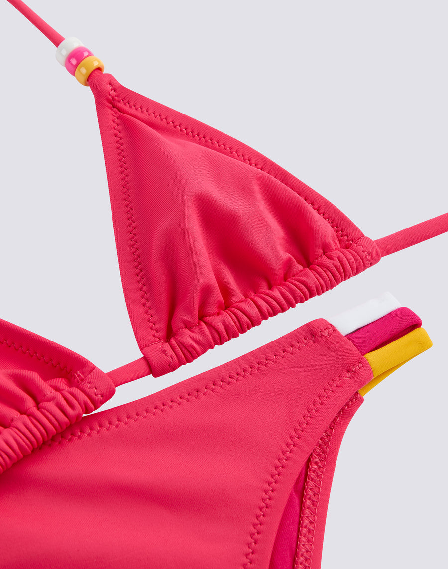 Bikini mare bambina con top a triangolo regolabile con i laccetti dietro al collo impreziositi da perline tricolori. I tre colori delle perline sono riproposti sul dettaglio tricolore laterale dello slip. I due pezzi del costume sono realizzati in tessuto VITA by Carvico confortevole, resistente e che non teme cloro e creme solari.
