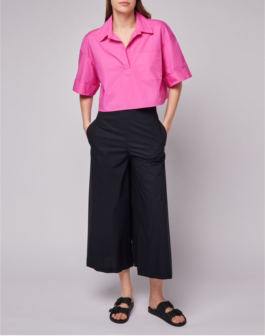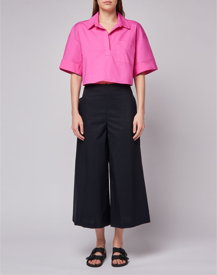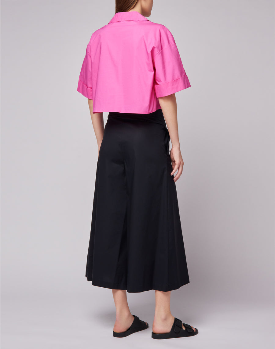 Camicia a maniche corte in popeline con tasca frontale e ampia apertura. Ideale sopra una gonna, dei pantaloni o degli shorts.