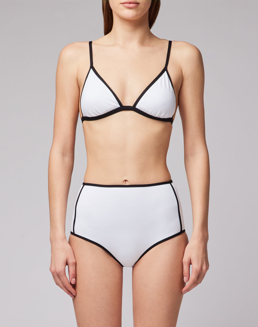 Un top bralette unico e inimitabile, dalla linea elegante e sinuosa, messa in luce dai colori a contrasto. Per chi cerca uno stile da spiaggia ricercato. Slip in coordinato venduto separatamente.