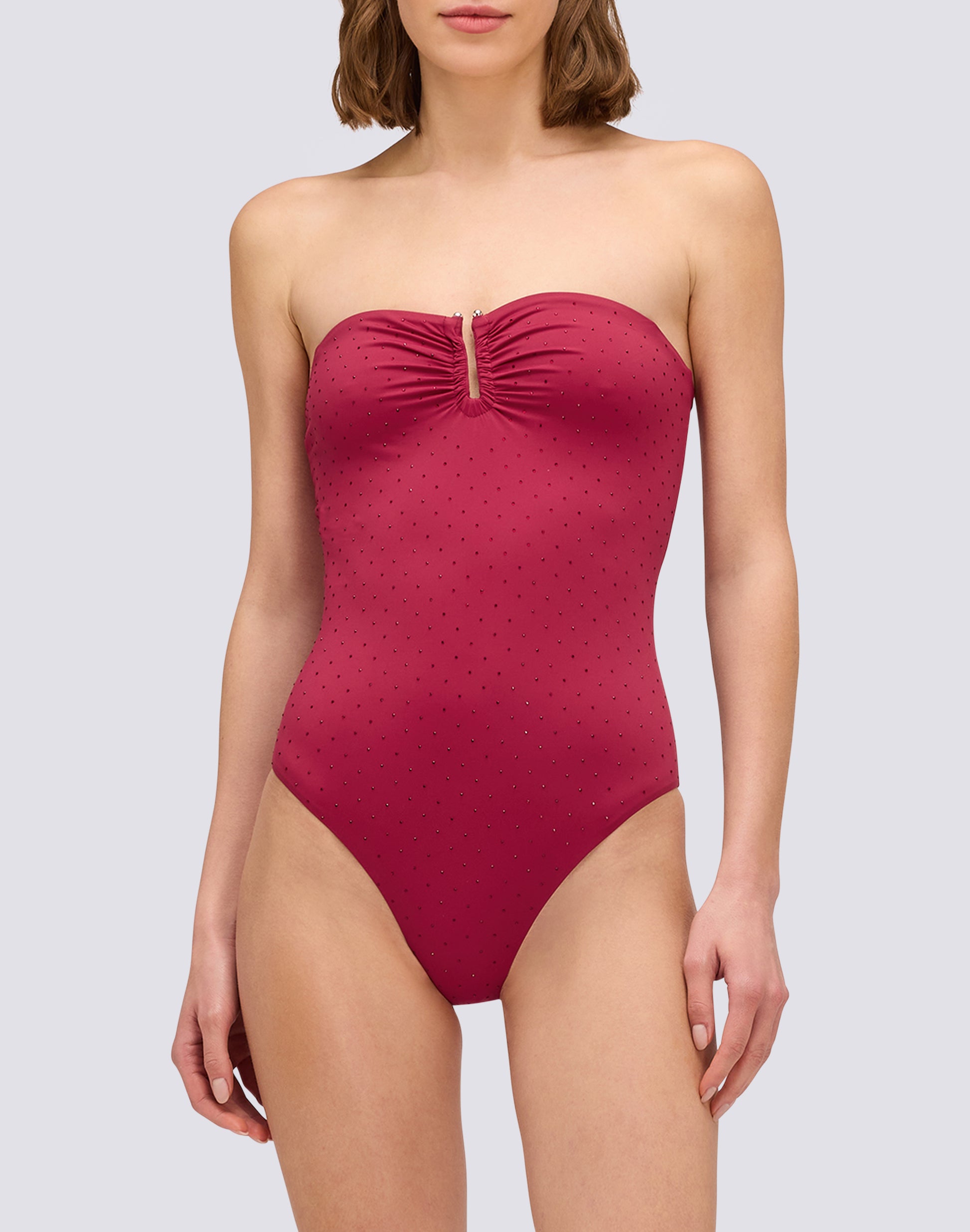 Il costume intero con strass e schiena alta è glamour vintage reinterpretato: brillantezza che cattura la luce, copertura elegante, spacco centrale che definisce. Per chi cerca uno stile retrò-chic con carattere. Questo è il costume che trasforma ogni momento in spiaggia in un'occasione speciale. Glamour, copertura elegante, brillantezza che si fa notare.
