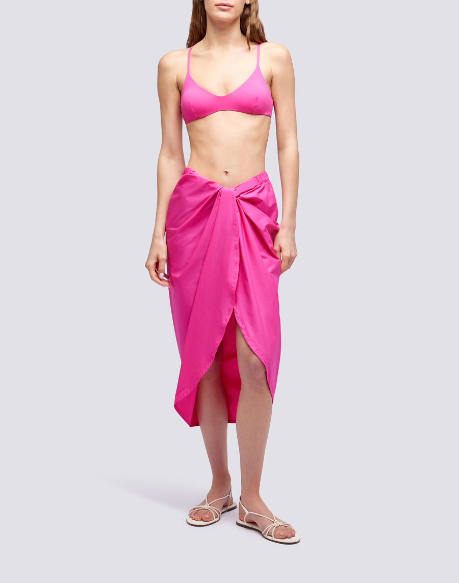 Questa gonna lunga in popeline è la scelta perfetta per uno stile versatile ed elegante. Grazie al suo taglio pareo, si adatta perfettamente a tutti i look da mare e non.