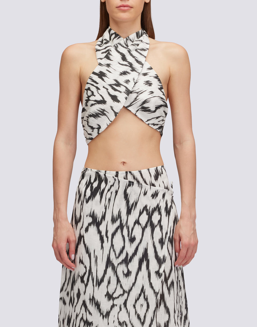 Top in lino cropped incrociato davanti con chiusura a nodo dietro il collo. Particolare, adatto per chi vuole creare un look più sbarazzino e originale.