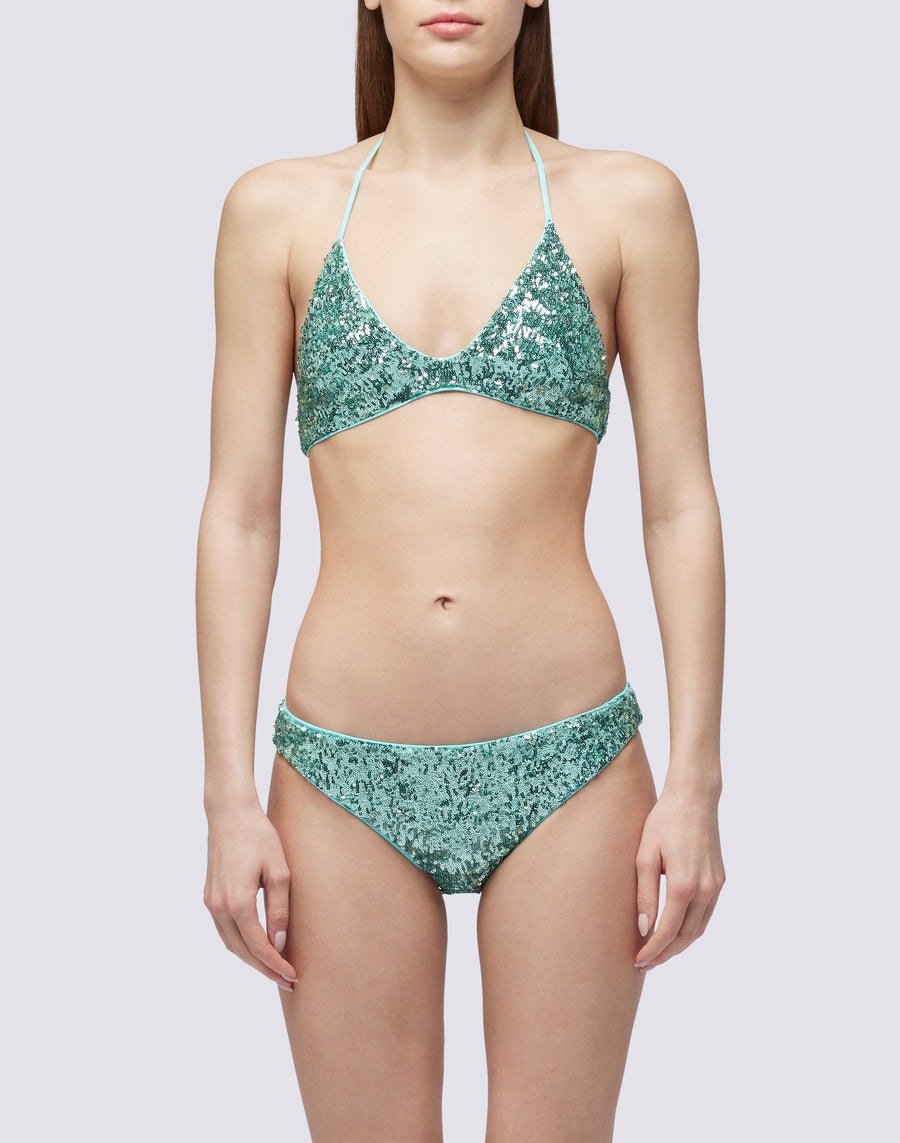 Rendi unico il tuo look da spiaggia con il top con paillettes Trissa. I profili e i lacci in morbida lycra lo rendono confortevole, donando un look alla moda. Da completare con il suo slip coordinato.