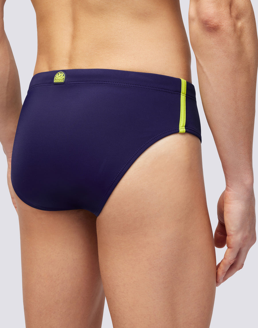 Slip uomo mare tinta unita con banda laterale, vita regolabile e coulisse con laccetto. Costume slip mare in tinta unita e banda laterale monocolore a contrasto, realizzato in ECONYL® Made in Italy, tessuto rigenerato ecosostenibile, resistente e che protegge dai raggi UV. Perfetto da indossare per nuotare e per prendere il sole e curare l'abbronzatura.