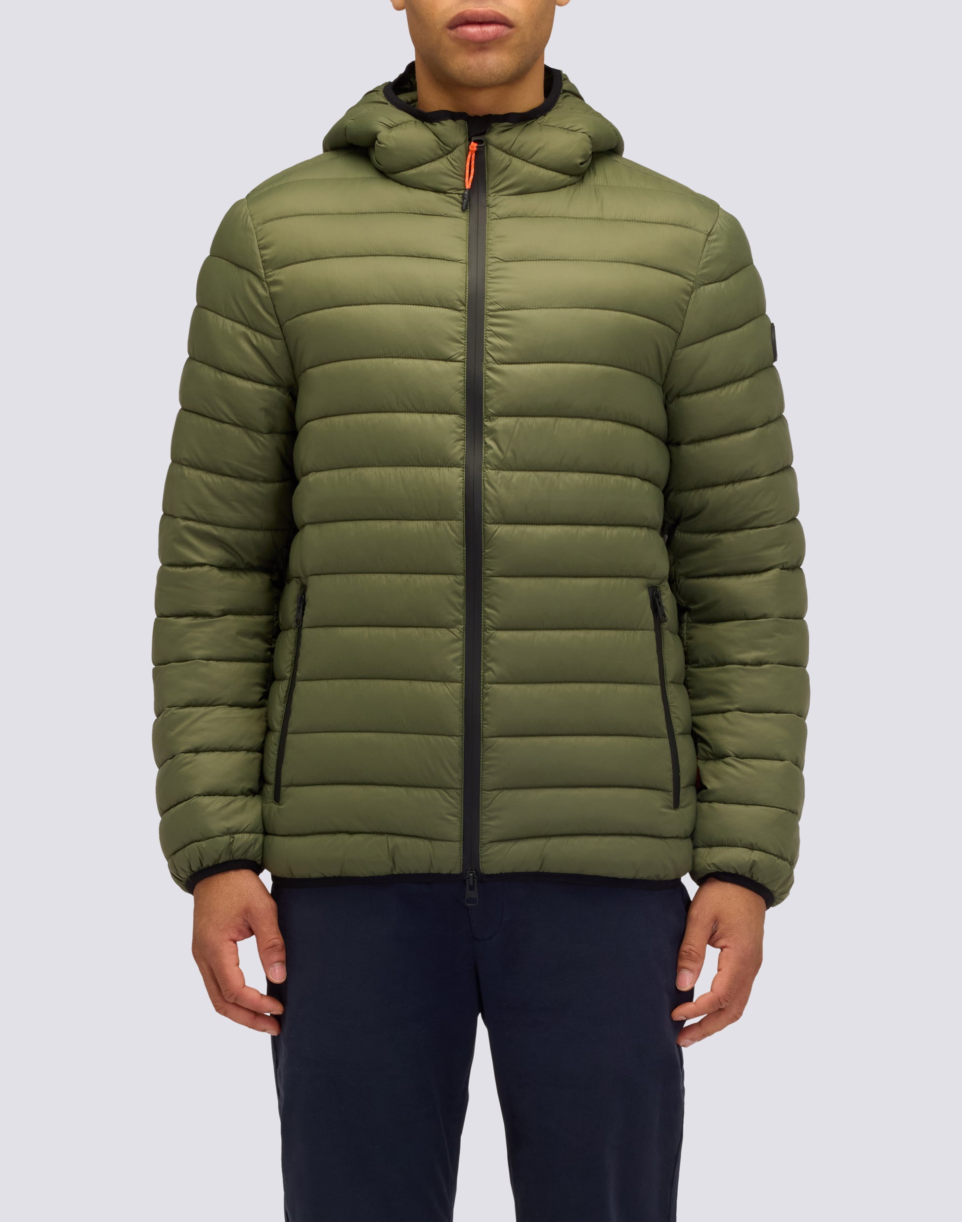 Piumino corto da uomo con cappuccio in tessuto nylon opaco superlight trapuntato a canali orizzontali e con imbottitura interna in fibra sintetica in poliestere riciclato Repreve. Capo dotato di numerosi dettagli tecnici, che ne fanno un giubbotto funzionale e pratica. Vestibilità regular, grado di calore medio.