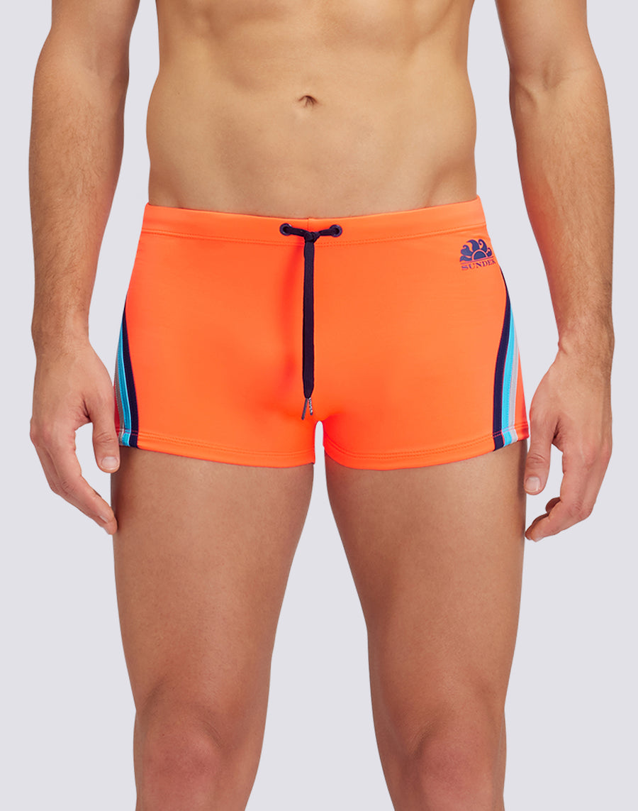 Boxer mare uomo a vita regolabile con coulisse e laccetto a contrasto: è un modello intramontabile al passo con i tempi perché ecosostenibile grazie al tessuto rigenerato ECONYL® Made in Italy. Puoi indossarlo sia per nuotare sia per prendere il sole e abbronzarti. Lunghezza gamba esterna 9"/23 cm (in taglia M).