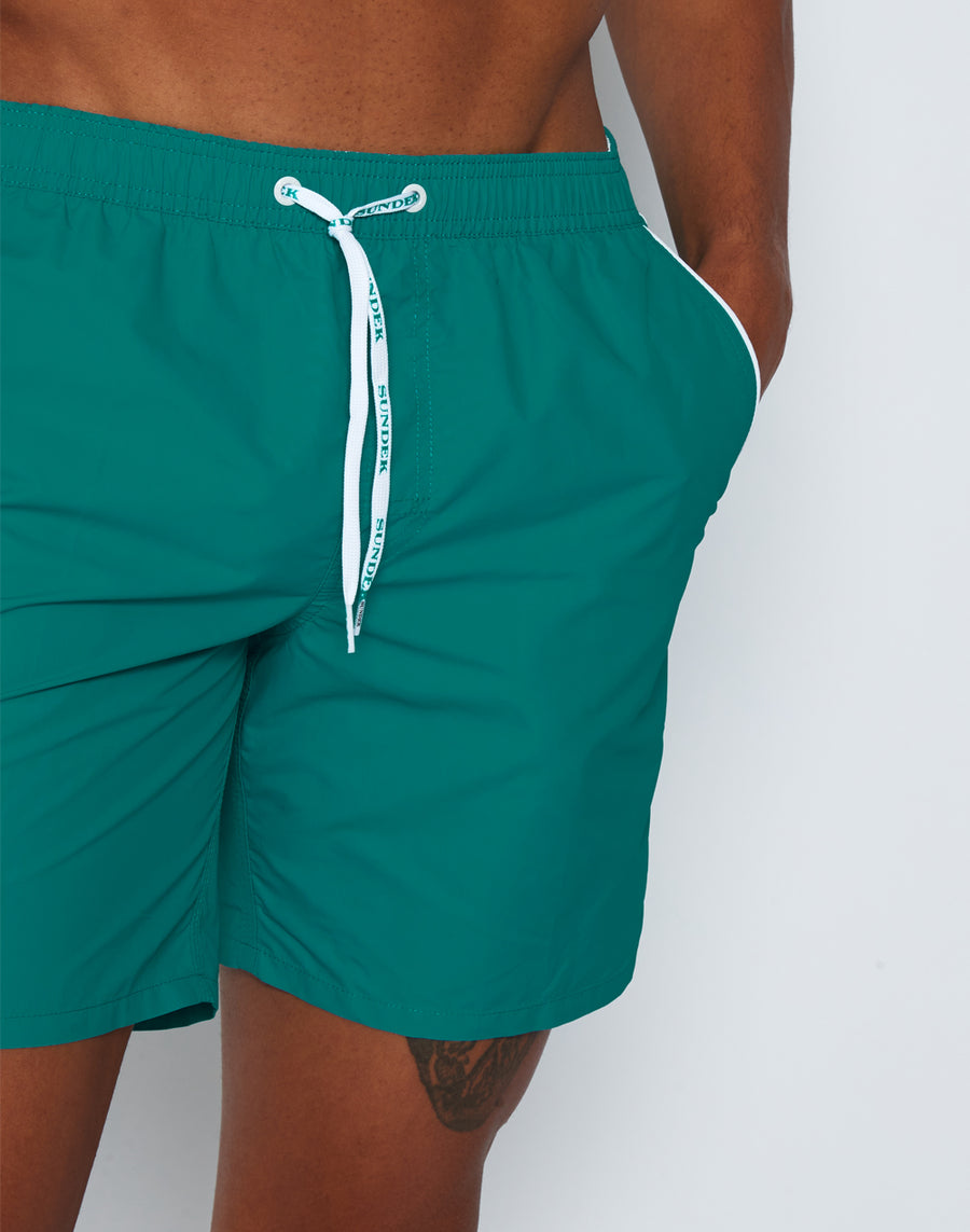 Pantaloncini da mare uomo con elastico in vita, regolabile grazie a laccio coulisse logato. Lunghezza 41 cm (taglia M), misurati sul lato esterno della gamba. L’elastico in vita con nastro coulisse lo rende comodo da indossare e tenere tutto il giorno, mentre le cuciture a tre aghi ne garantiscono la durata nel tempo.