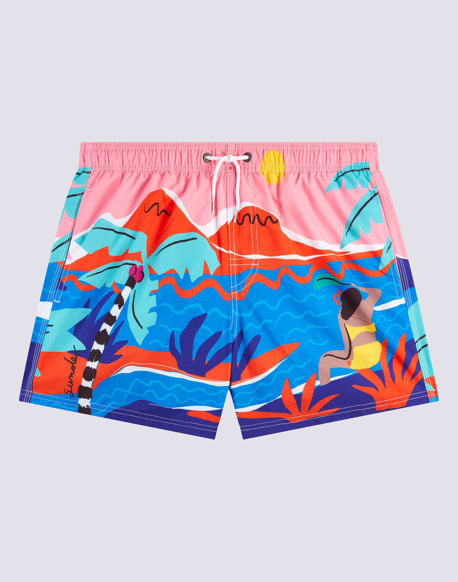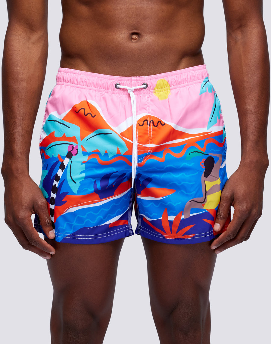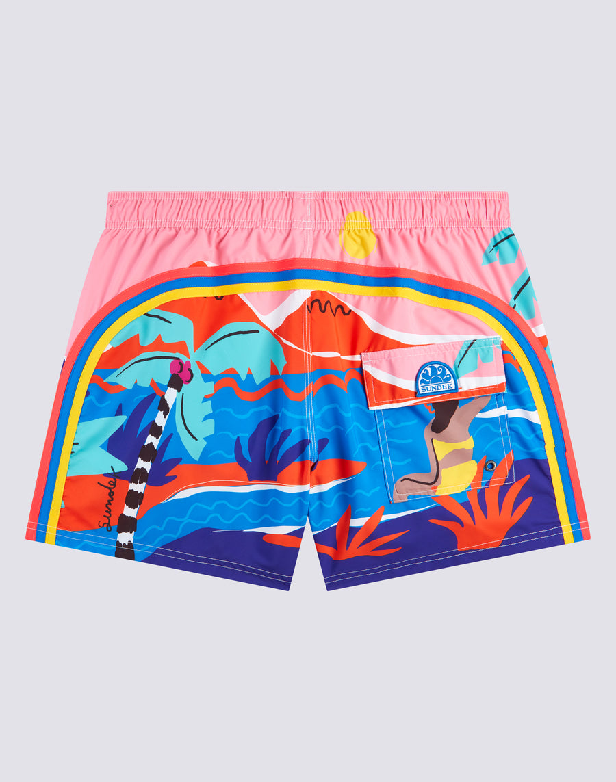 Costume da bagno con coulisse elastica in vita, in leggero tessuto Repreve® riciclato da bottiglie di plastica. Iconico dettaglio arcobaleno sul back e stampa Polinesia Dream. Larghezza esterno coscia 14"/35 cm (taglia m).