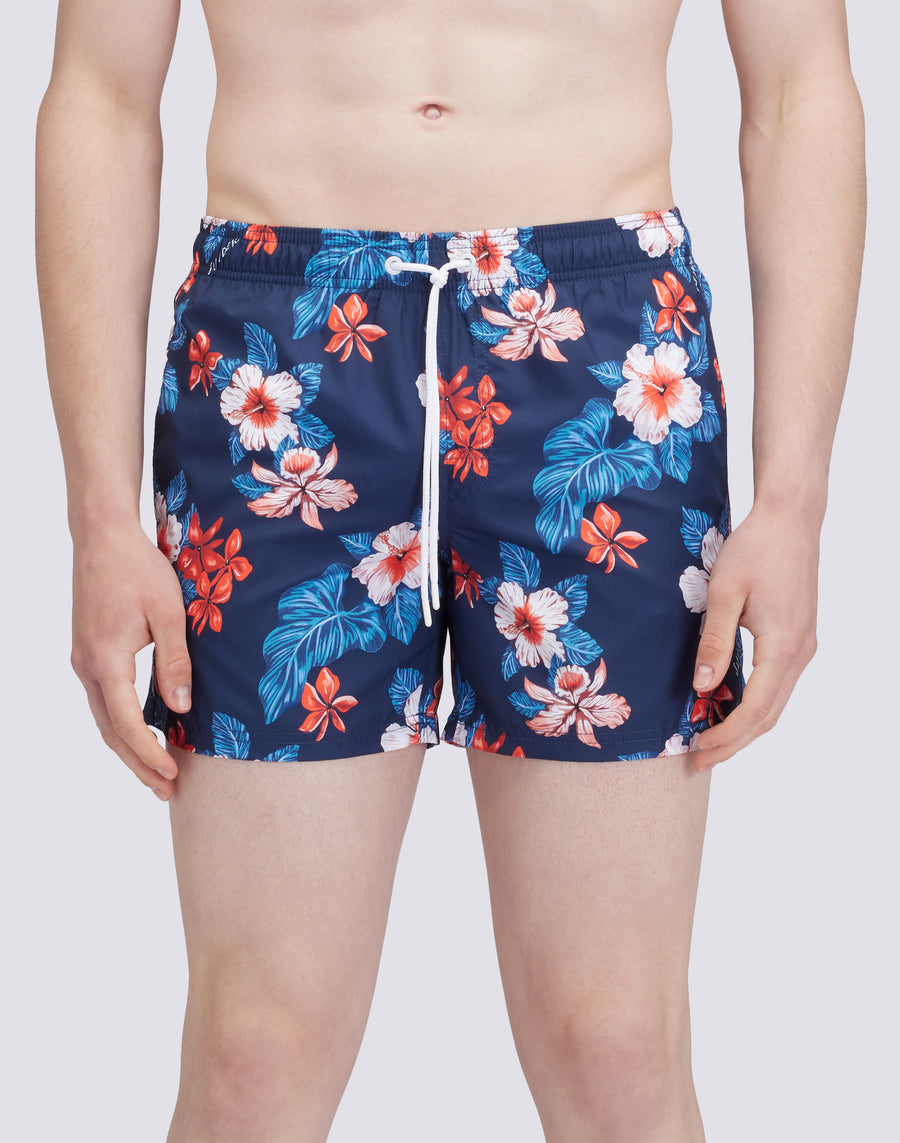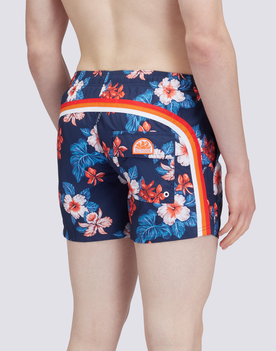 Costume da bagno con coulisse elastica in vita, in leggero tessuto Repreve® riciclato da bottiglie di plastica. Con stampa floreale Heaven dream e il tradizionale arcobaleno Sundek sul back. Lunghezza esterno coscia 14"/35 cm (taglia m).