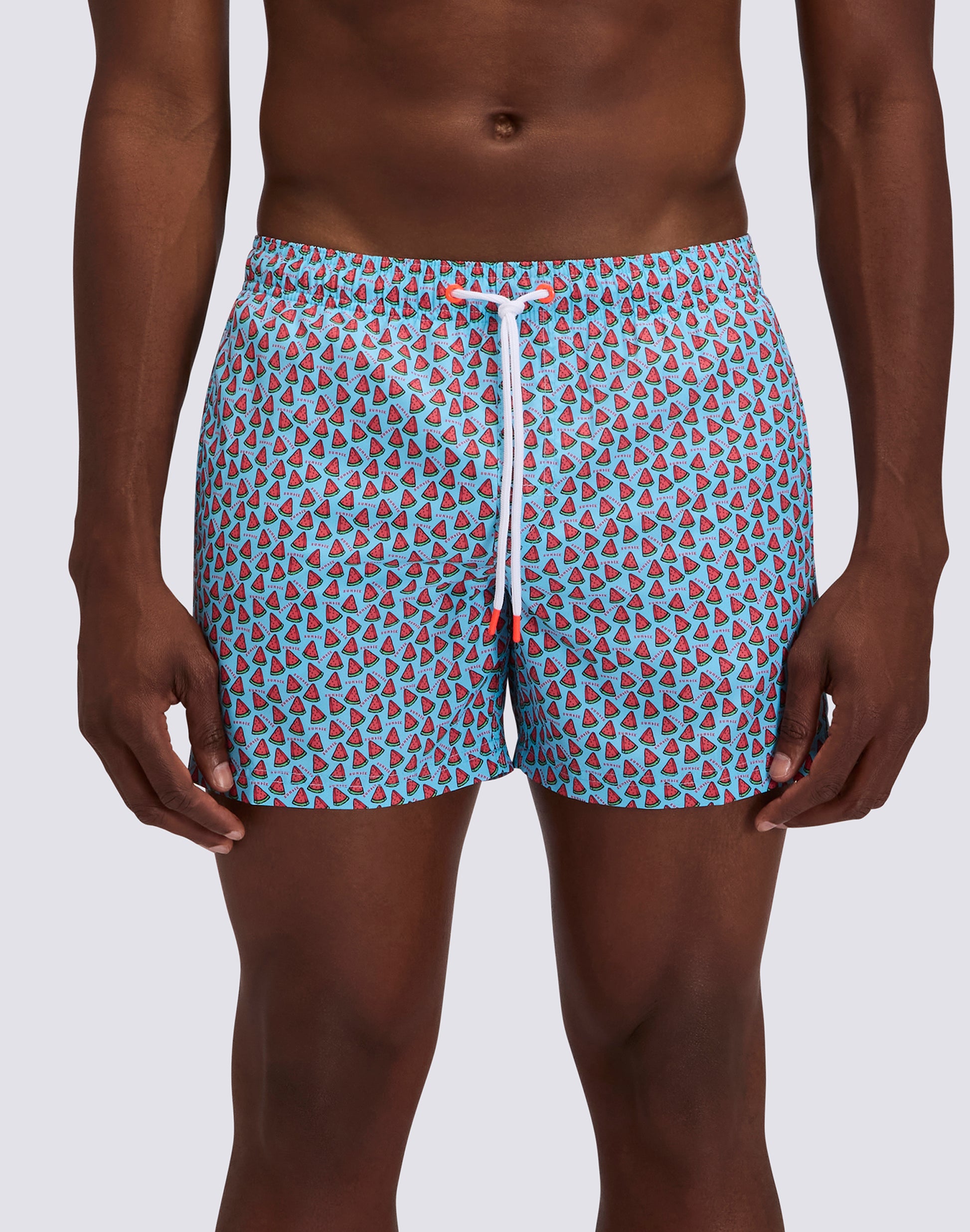 Costume da bagno a pantaloncino da uomo in tessuto riciclato Repreve®, leggero, dall'asciugatura rapida. Dettaglio iconico arcobaleno Sundek sul back e stampa Fruit Fiesta. Lunghezza esterno coscia 14”/35 CM (in taglia M).