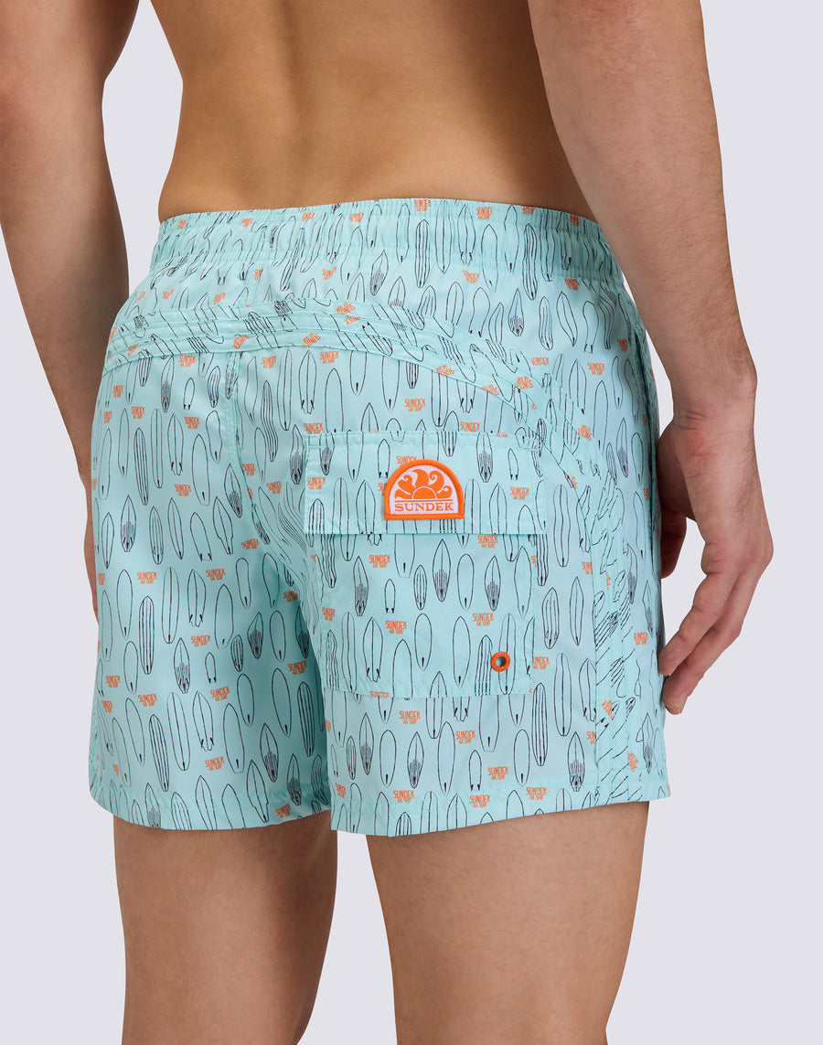 Costume da bagno con coulisse elastica in vita, in leggero tessuto Repreve® riciclato da bottiglie di plastica. Microstampa surf e il tradizionale arcobaleno Sundek sul back. Larghezza esterno coscia 14"/35 cm (taglia m). Abbina anche lo slip della stessa fantasia!