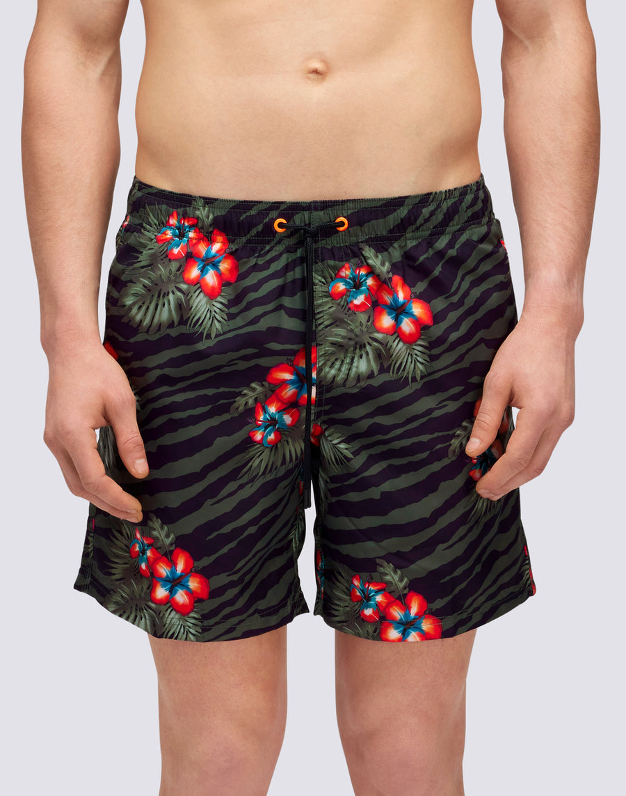 Costume da bagno da uomo con coulisse elastica in vita, in leggero tessuto repreve® riciclato da bottiglie di plastica. Iconico dettaglio arcobaleno sul back. Stampa Jungle Hibi. Lunghezza esterno coscia 16"/41 cm (taglia m).