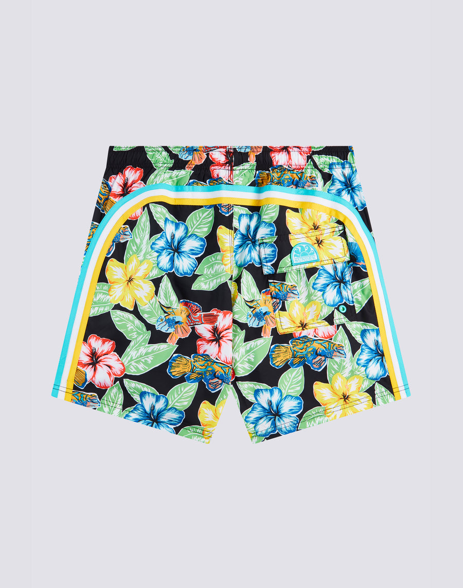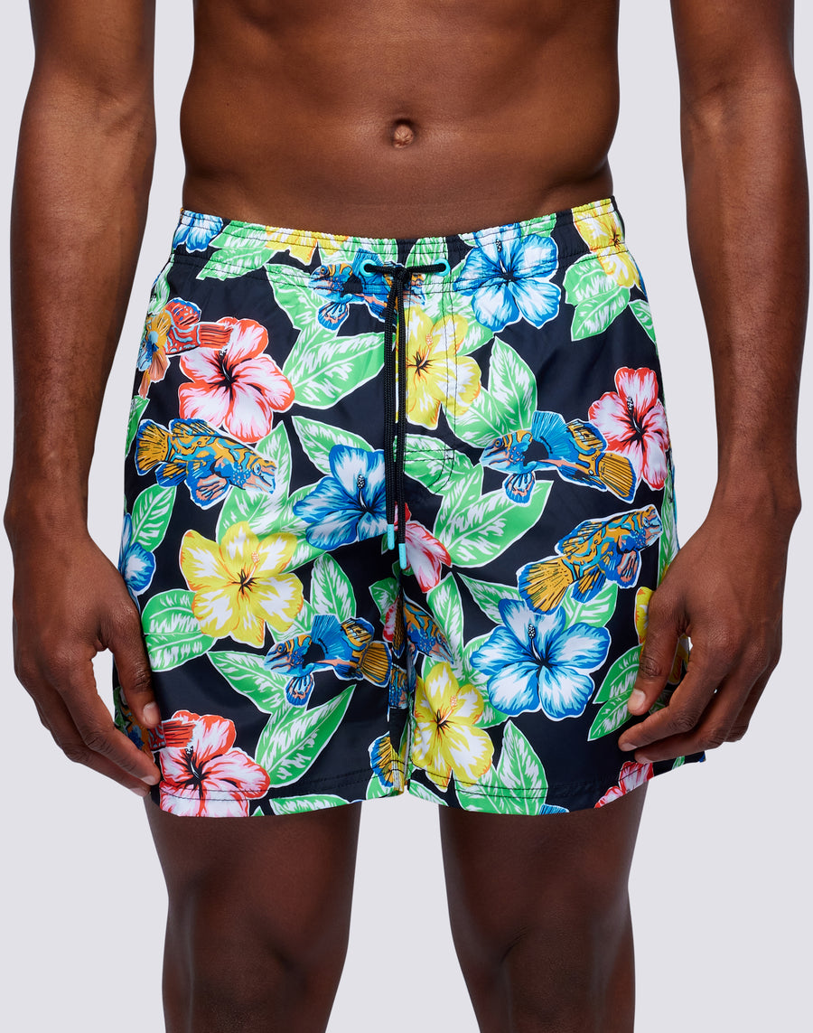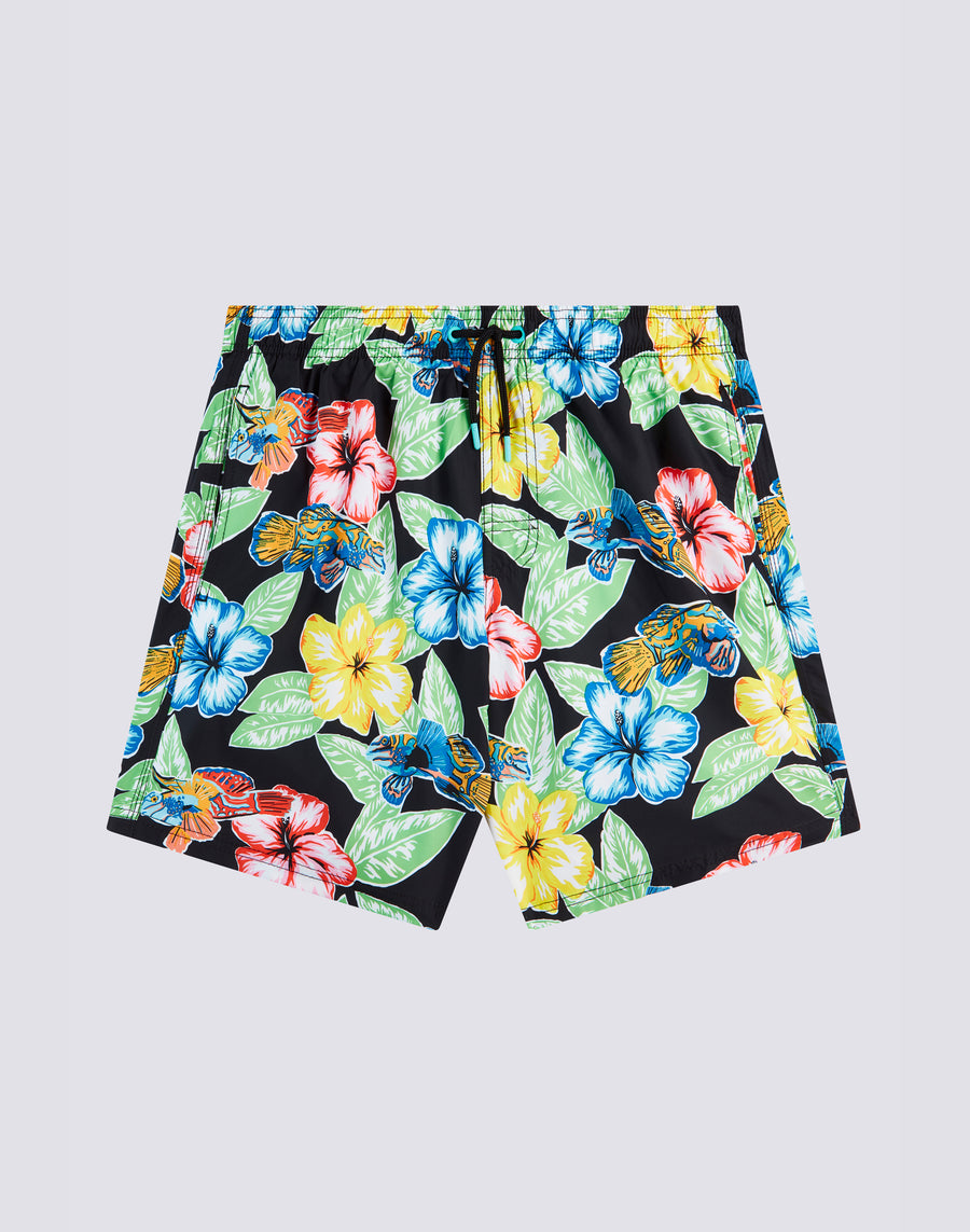 Costume da bagno da uomo con coulisse elastica in vita, in leggero tessuto Repreve® riciclato da bottiglie di plastica. Iconico dettaglio arcobaleno sul back. Stampa d'archivio Animal Fish. Lunghezza esterno coscia 16"/41 cm (taglia M).