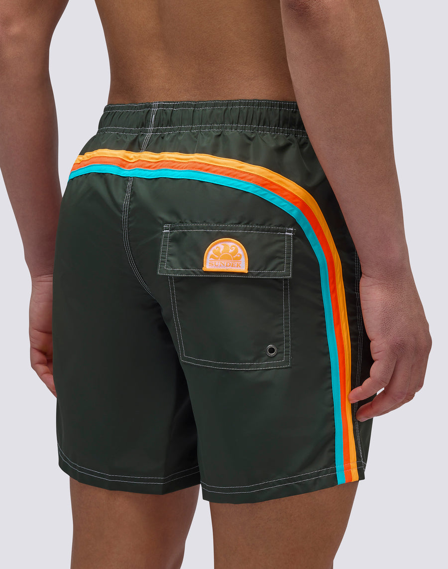 Tutto lo stile senza tempo Sundek in questo boardshort di lunghezza media e con vita elasticata. Elegante, confortevole, destinato a durare vacanza dopo vacanza: è il nostro boardshort classico con coulisse in vita e arcobaleno a contrasto sul retro, realizzato nel nostro storico tessuto nylon taffetà leggero e che si asciuga rapidamente, resistente, con cuciture a tre aghi per un rinforzo ulteriore. Lunghezza 41 cm (taglia M), misurati sul lato esterno della gamba.
