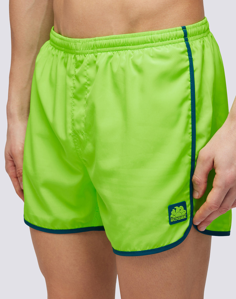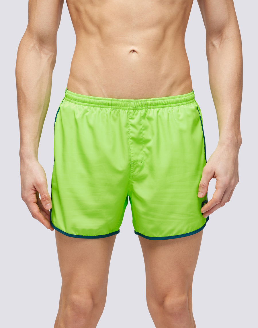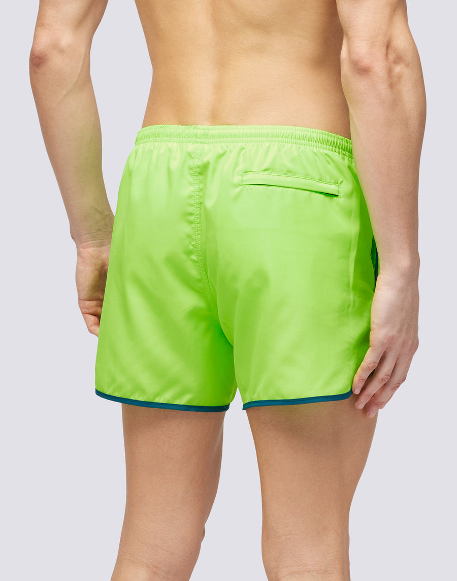 Costume a pantaloncino da uomo corto con vita elasticata, realizzato in poliestere leggero. Dotato di spacchetti laterali arrotondati. Lunghezza esterno coscia 13”/33 CM (taglia M).