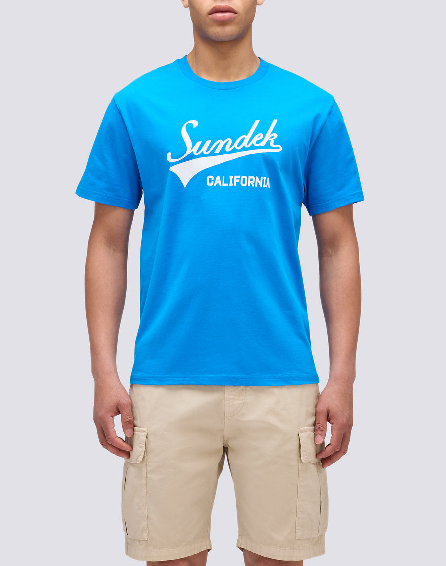 Aggiungi un tocco vivace al tuo look con la nostra t-shirt da uomo a mezza manica. Realizzata in morbido cotone e arricchita dalla scritta SUNDEK CALIFORNIA sul davanti, questa t-shirt è perfetta per outfit casual ma sempre alla moda.