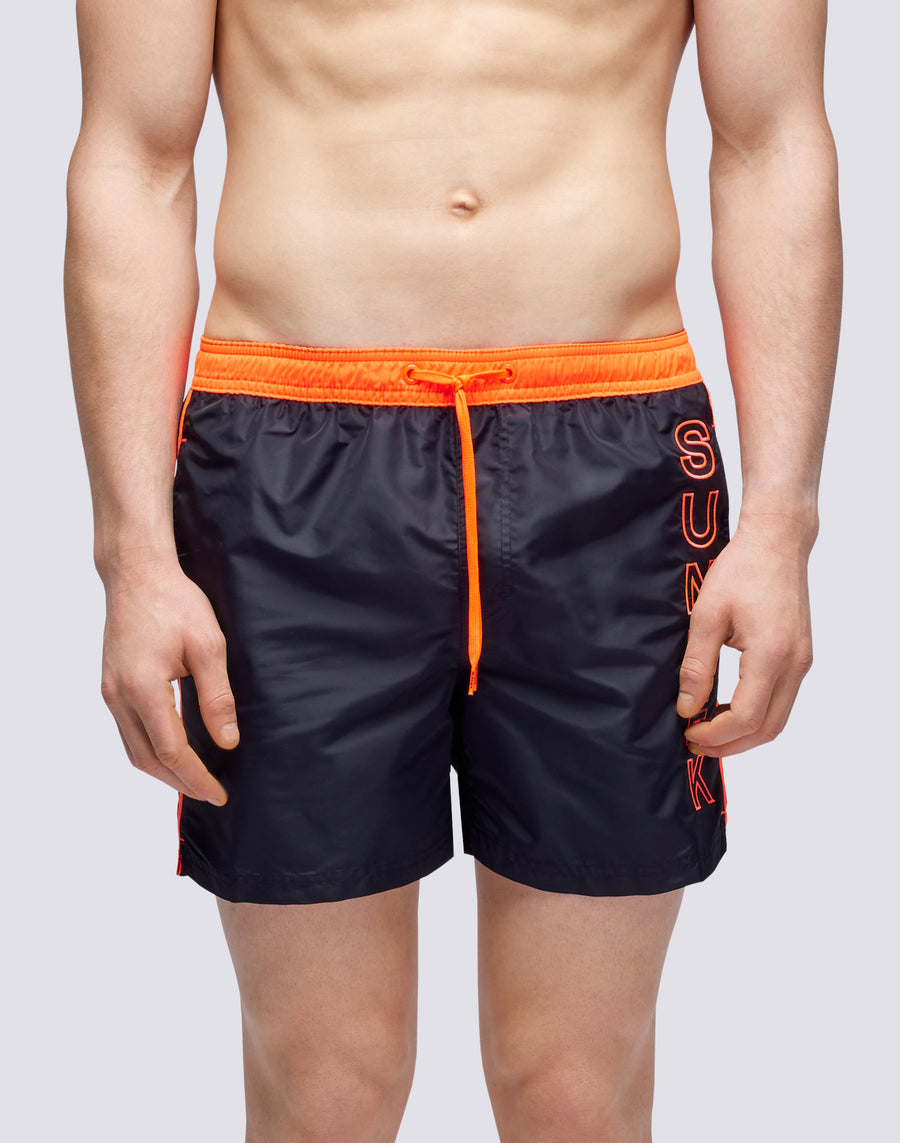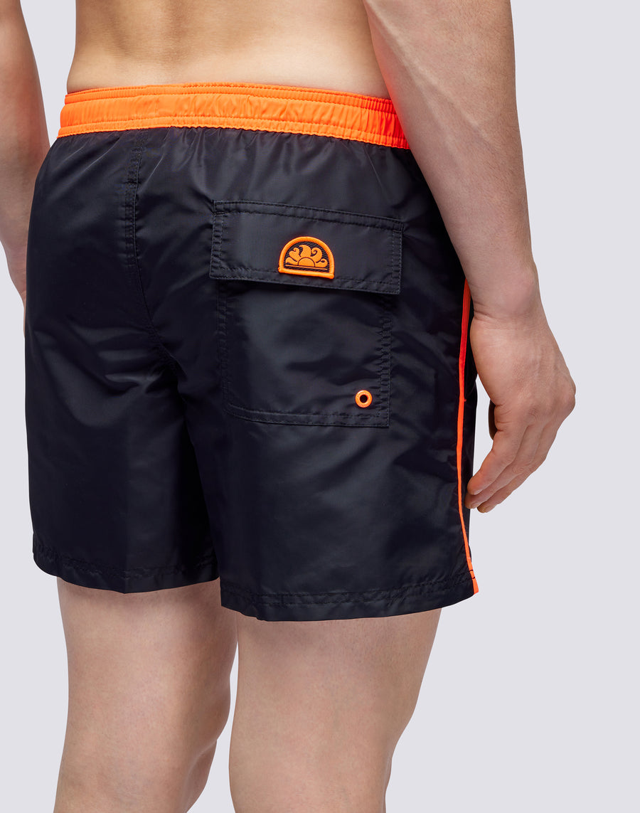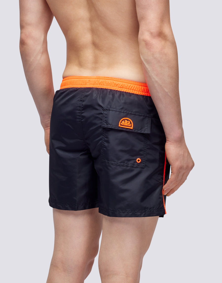 Rinfresca il tuo guardaroba beachwear con questo costume corto a pantaloncino, perfetto per le tue giornate in spiaggia o in piscina. Con il tessuto elasticizzato e il piping a contrasto, questo costume da bagno da uomo garantisce un look iconico durante tutta l'estate.