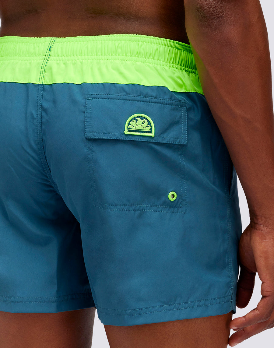 Costume da bagno a pantaloncino per uomo corto a vita elasticata. Dotato di coulisse, elastico logo in vita e tasca posteriore con velcro. Si asciuga rapidamente grazie al poliestere leggero con cui è realizzato. Lunghezza esterno gamba 14"/35 cm (in taglia M).