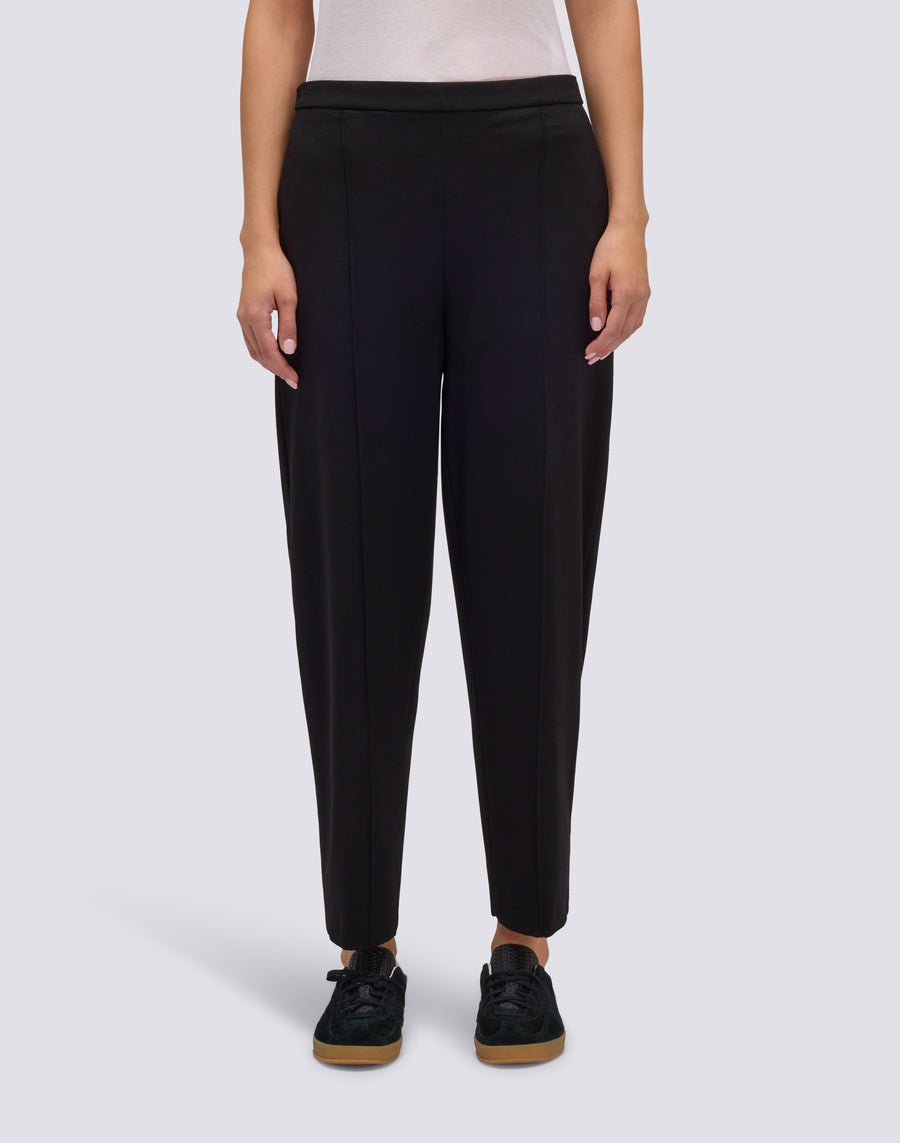 Pantaloni lunghi da donna in Punto Milano con vita semi elastica, piega frontale centrale e tasche laterali. Morbidi, vestibilità relaxed.