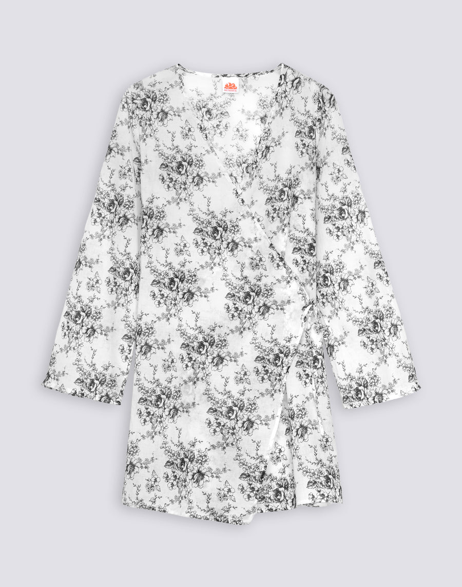 L'abito corto da donna in voile di cotone stile wrapover con fantasia Rose de Joie unisce leggerezza e stile avvolgente: design a portafoglio regolabile, tessuto semi-trasparente arioso, pattern floreale romantico. Per chi cerca femminilità casual.