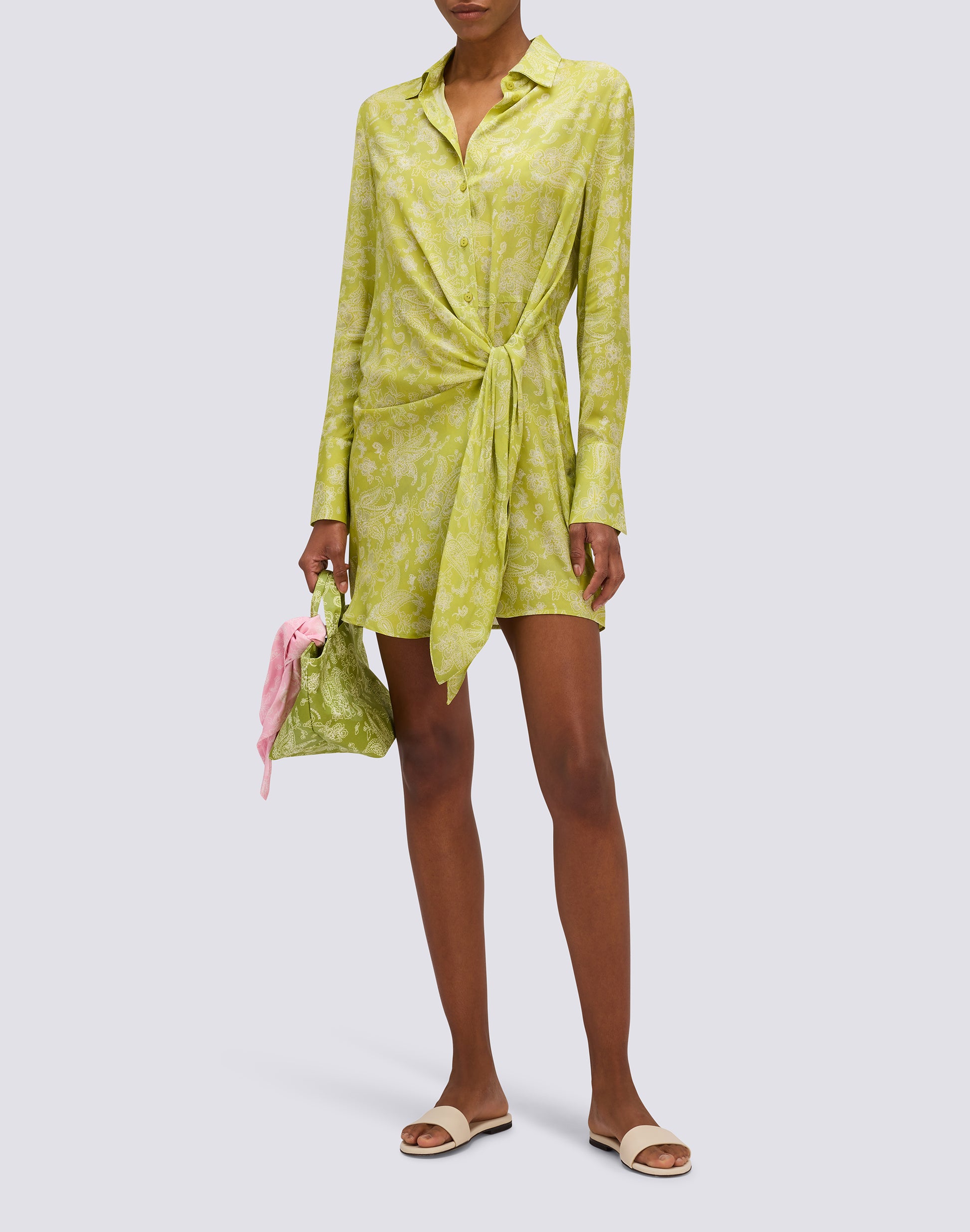 L'abito camicia corto da donna in viscosa con stampa Hibi Paisley e nodo frontale unisce fluidità naturale e stile bohémien: maniche lunghe, pattern paisley simil bandana, nodo centrale decorativo. Per chi cerca versatilità casual dalla spiaggia alla città.
